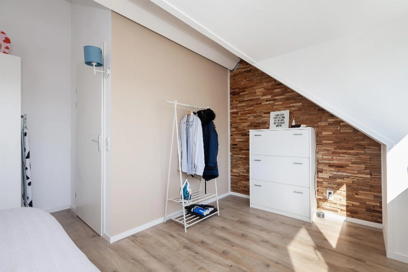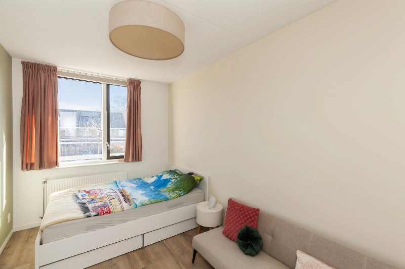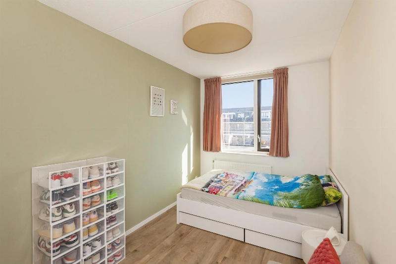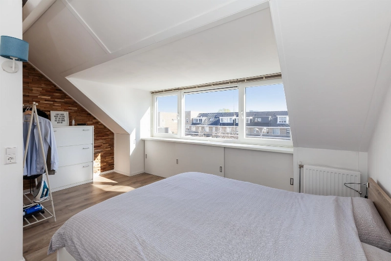Slaapkamer 4 ligt aan de voorzijde van de woning en heeft een mooie grote dakkapel met drie elektrische bedienbare rolluiken. Daarnaast is er een aparte kast met de c.v. combiketel en de aansluitingen voor een wasmachine en droger.