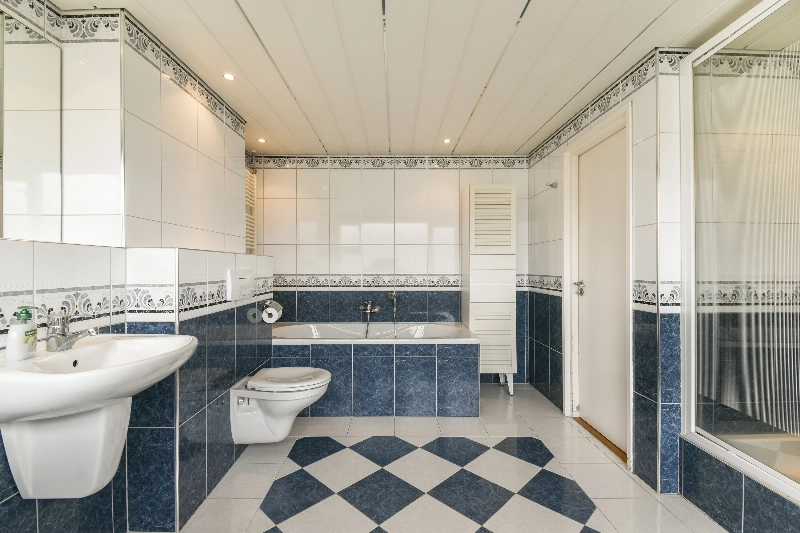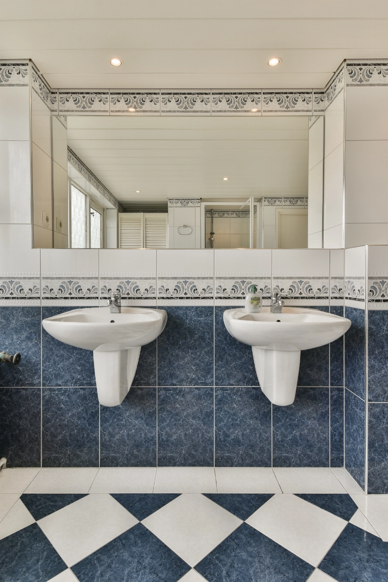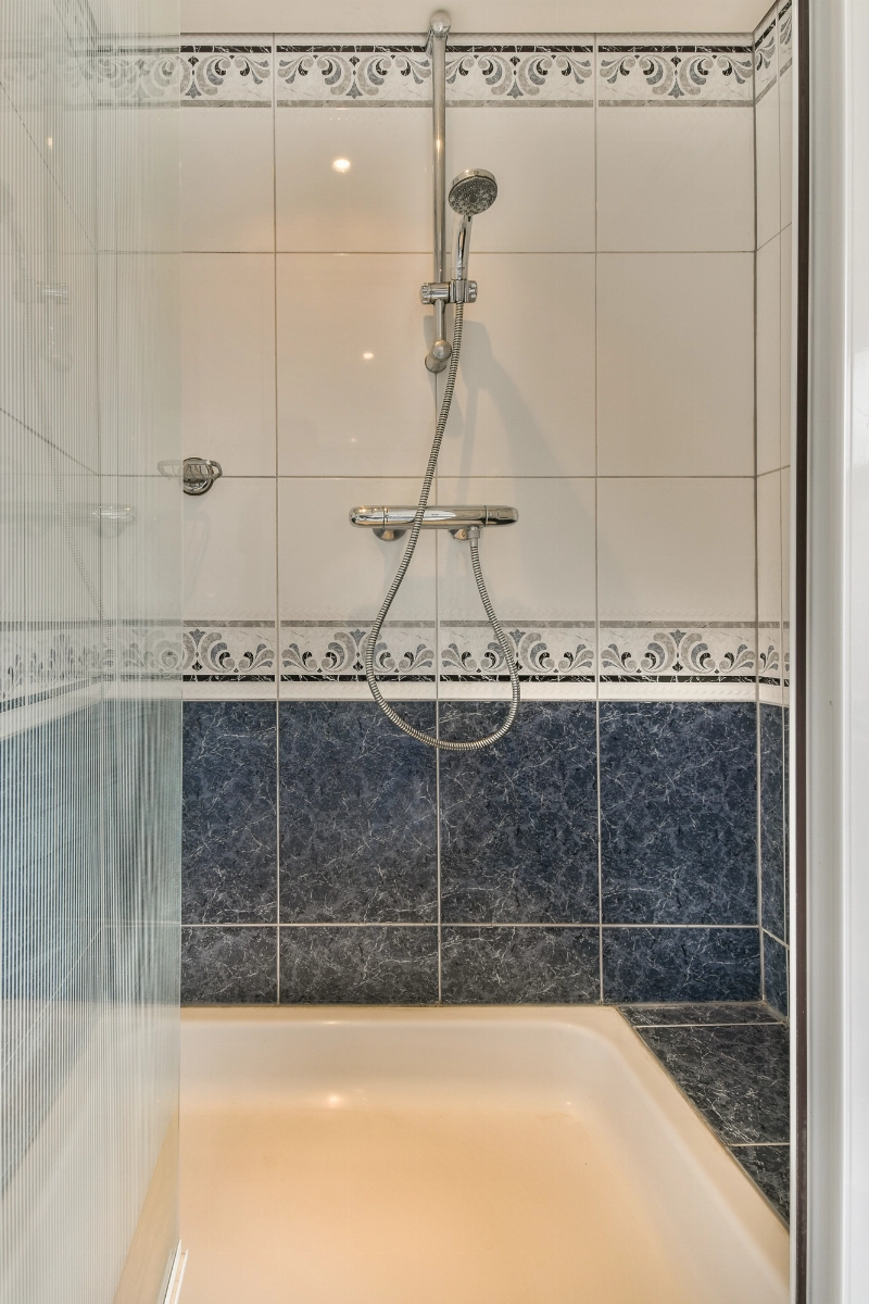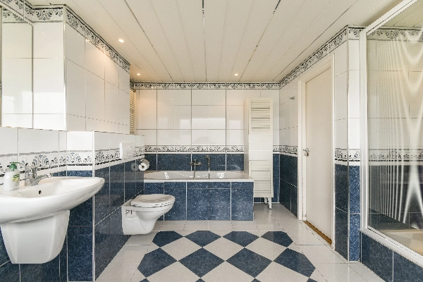 De badkamer is in het verleden vergroot waardoor deze zeer ruim is. Er is blauw/witte betegeling, een ligbad, een douche, een zwevend toilet, twee wastafels, een wasmachine- en drogeraansluiting en een deur naar het balkon met een leuk uitzicht op de tuin.