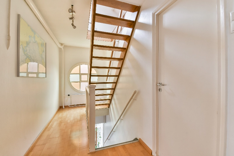 Ruime overloop met een mooi rond glas-in-lood raam. De laminaatvloer is doorgelegd over de gehele verdieping.