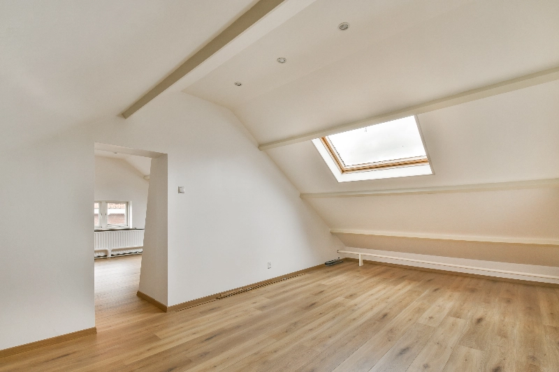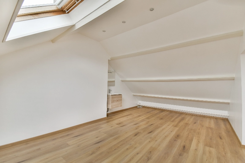 De zolderkamer is zeer ruim en beschikt over een dakraam en een modern wastafelmeubel met lades en spiegel.