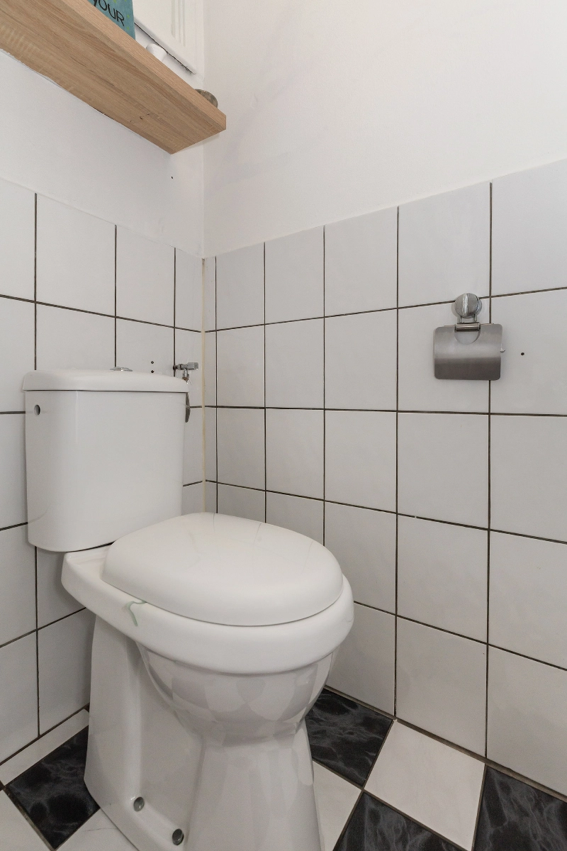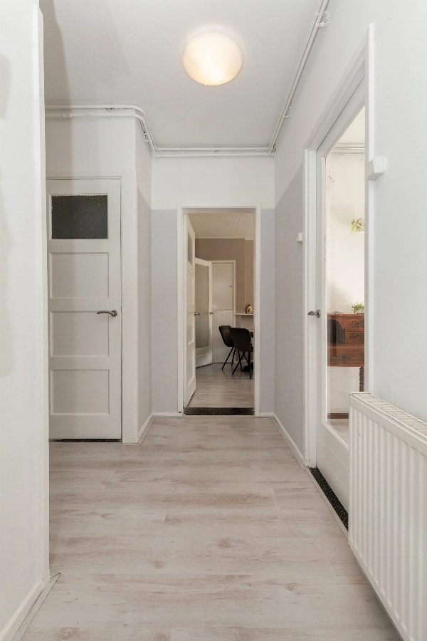 Je stapt binnen in een ruime hal met een stijlvolle, lichte laminaatvloer die naadloos doorloopt in het gehele appartement - een perfecte basis voor jouw interieur. Er is een keurige toiletruimte met lichte betegeling en een duoblok.