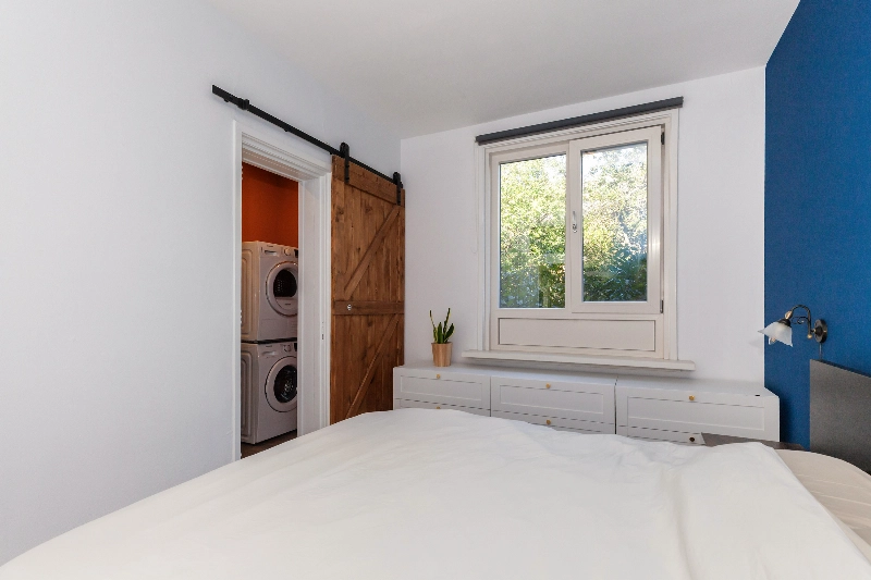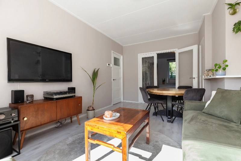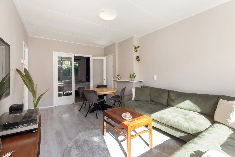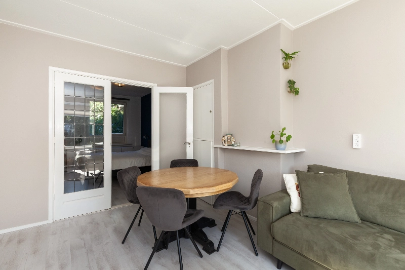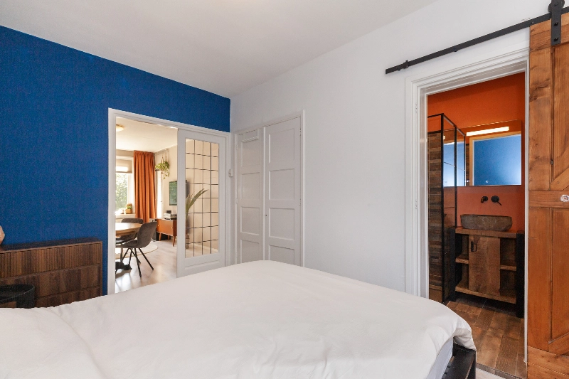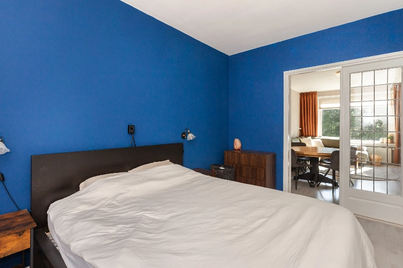 De gezellige woonkamer is een heerlijke plek om te ontspannen. Via dubbele deuren kom je in de grote slaapkamer, voorzien van twee kasten en een prachtige loftdeur richting de badkamer.
