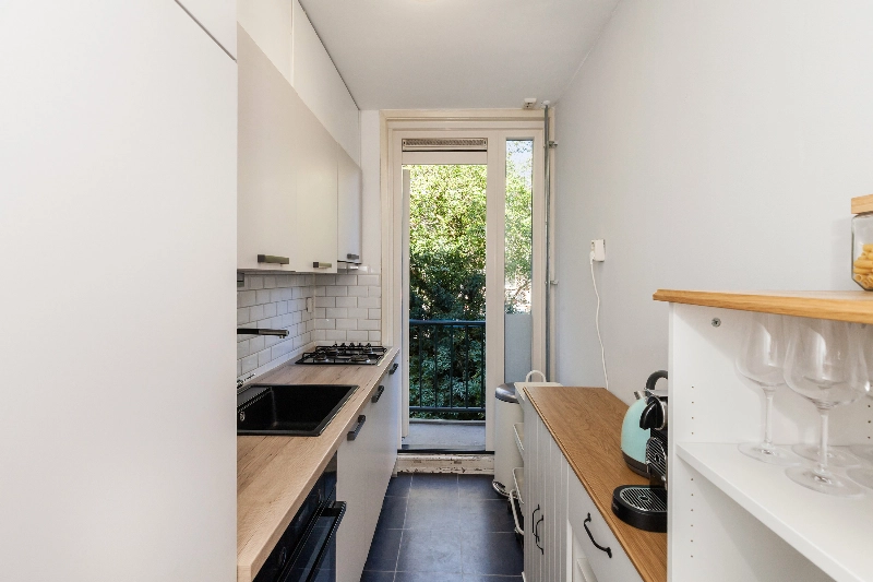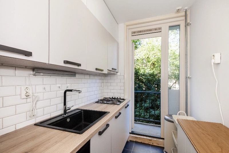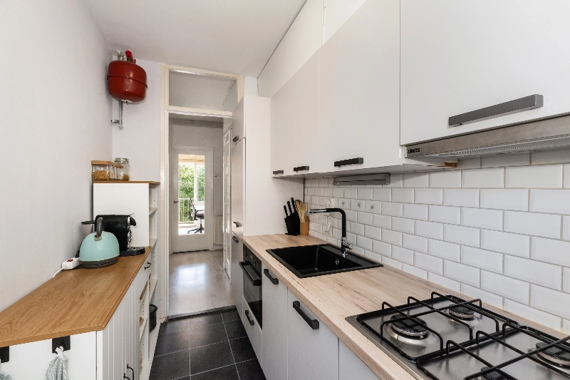 De moderne keuken is echt een plaatje. Geheel uitgevoerd in een taupe kleur met een fraai aanrechtblad en voorzien van een gaskookplaat met vlakschermafzuigkap, een vaatwasser, een oven en een koelkast. Vanuit de keuken stap je zo het tweede balkon op.