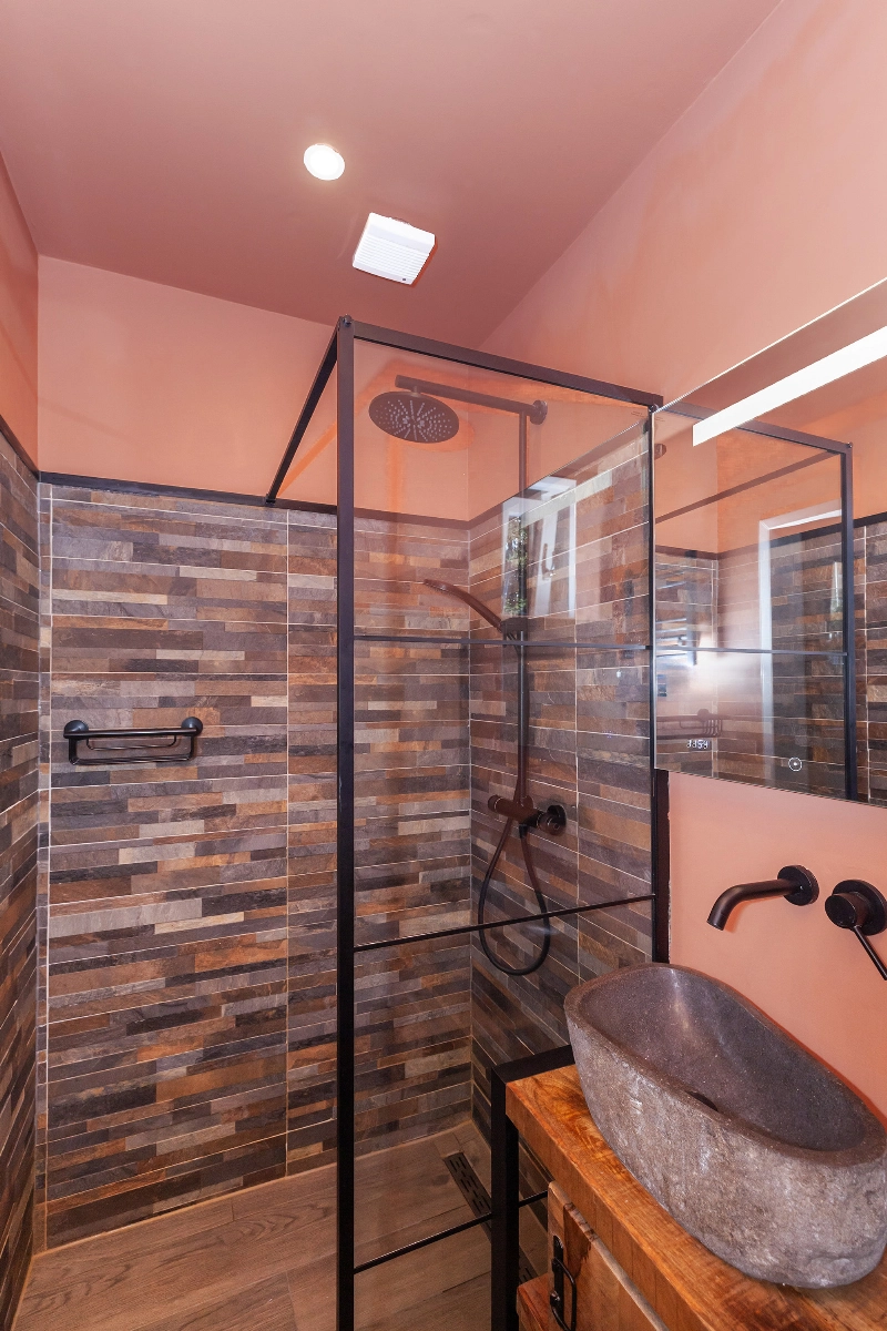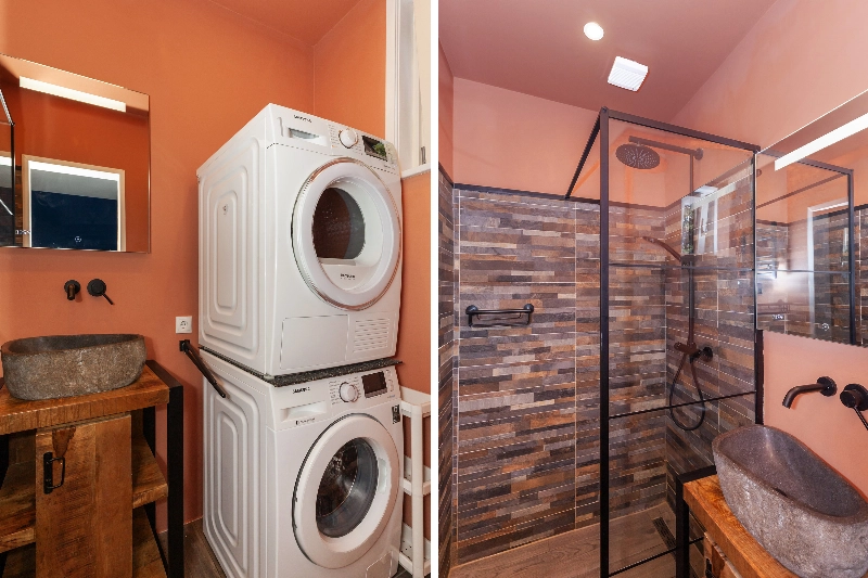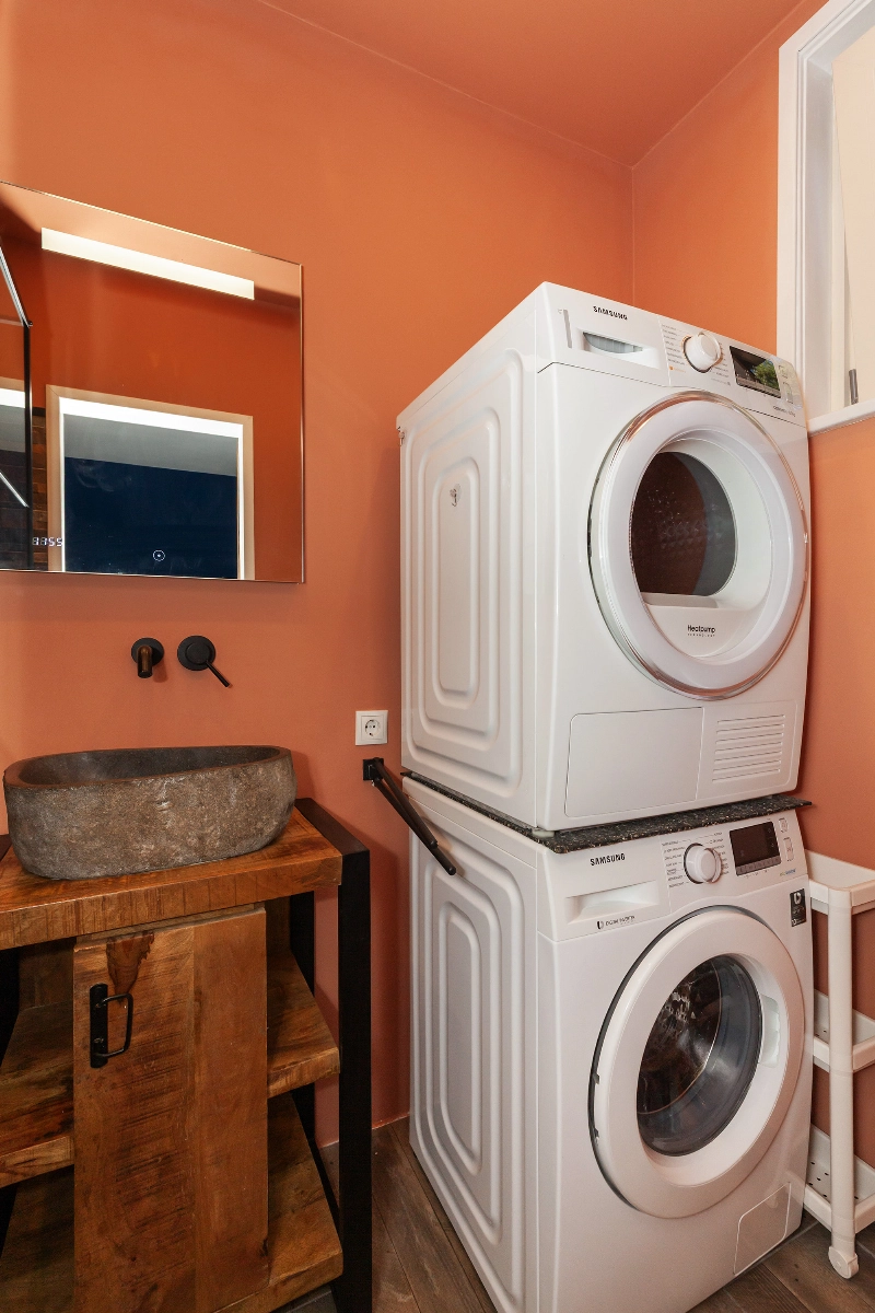 Deze moderne badkamer heeft houtlook vloertegels en natuursteenlook wandtegels in combinatie met stucwerk. Verder is er een grote inloopdouche met draingoot en stortdouche, een houten wastafelmeubel met waskom, een radiator en een aansluiting voor een wasmachine en droger.