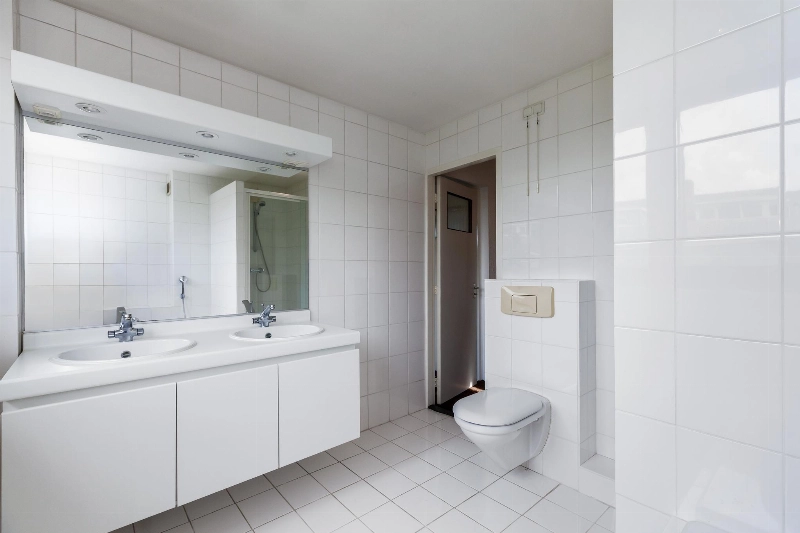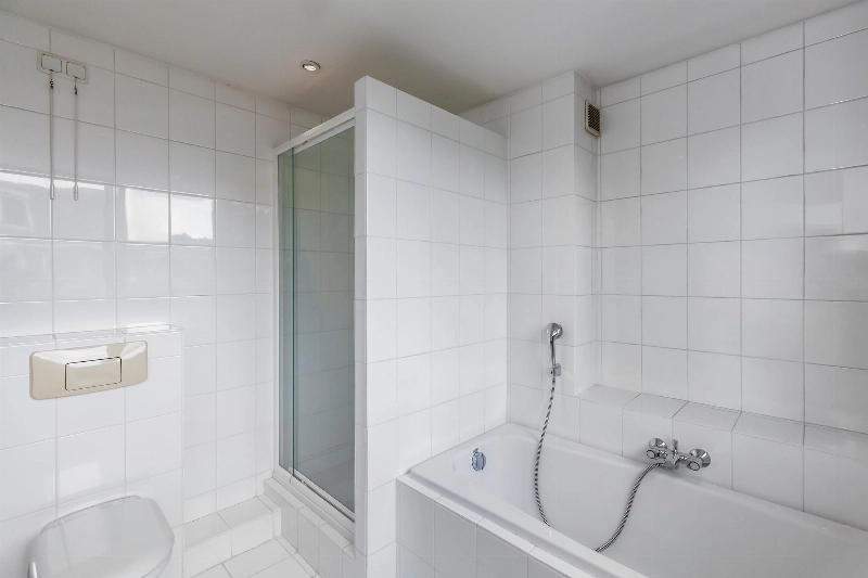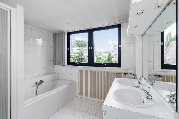 De keurige badkamer heeft een witte wand- en vloerbetegeling en beschikt over een ligbad, een douchehoek, een radiator en een dubbel wastafelmeubel met veel opbergruimte.