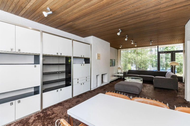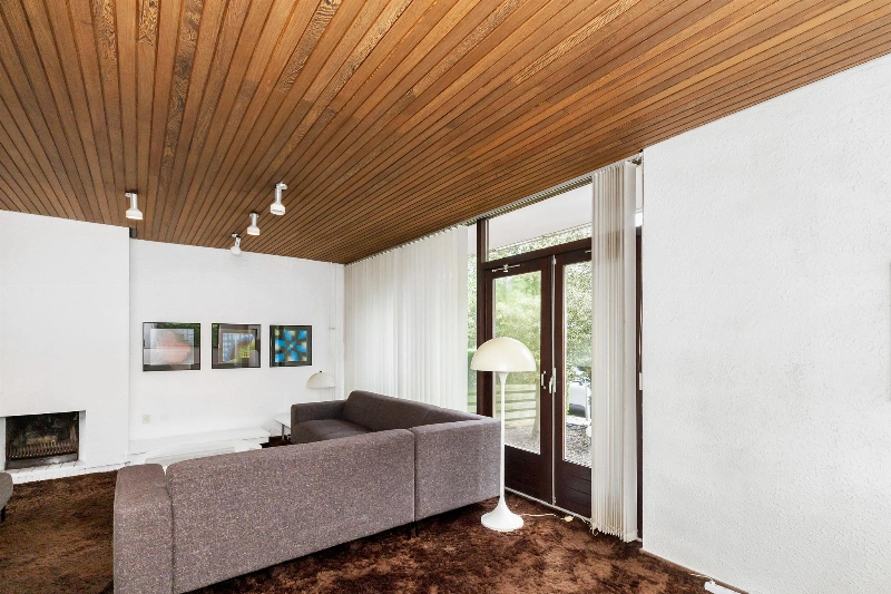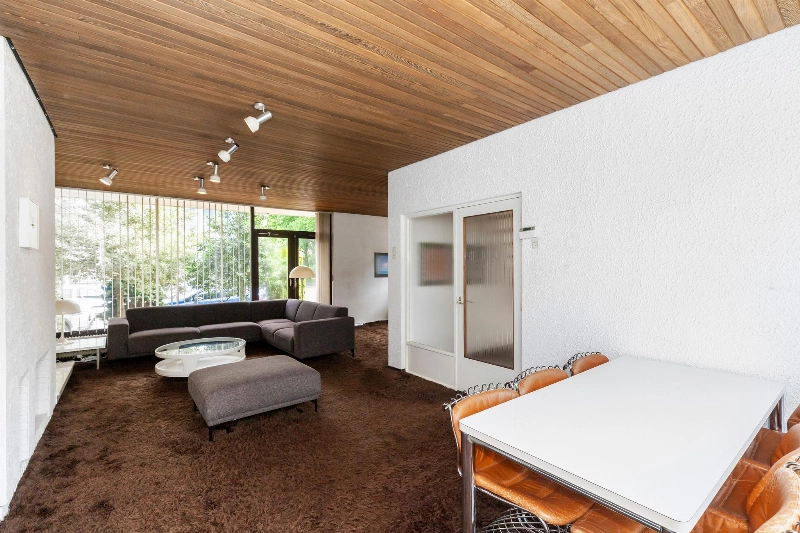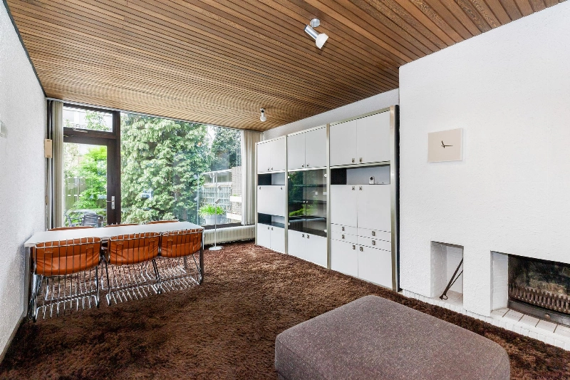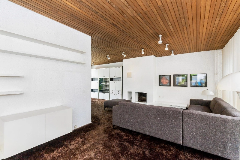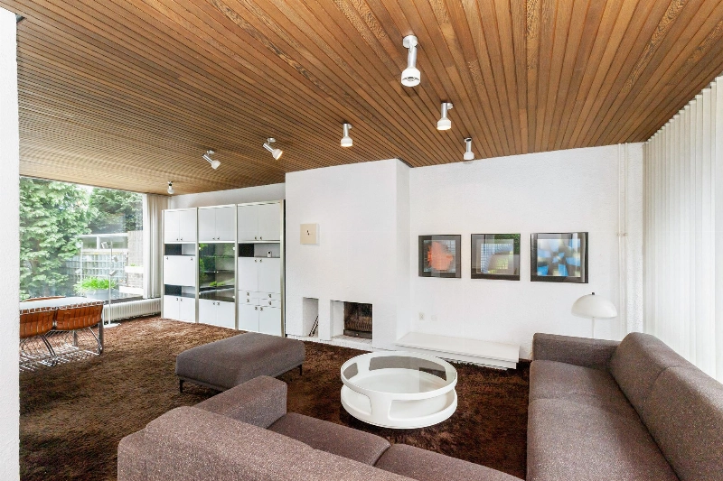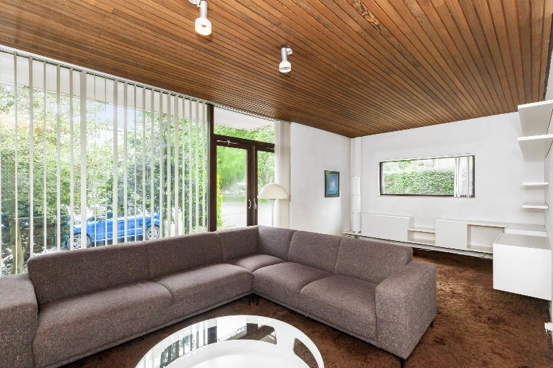 De woonkamer is door zijn afmeting en L-vorm een echte living. Er is een prachtig Wengé plafond, een sfeervolle open haard en de grote ramen laten veel licht door.