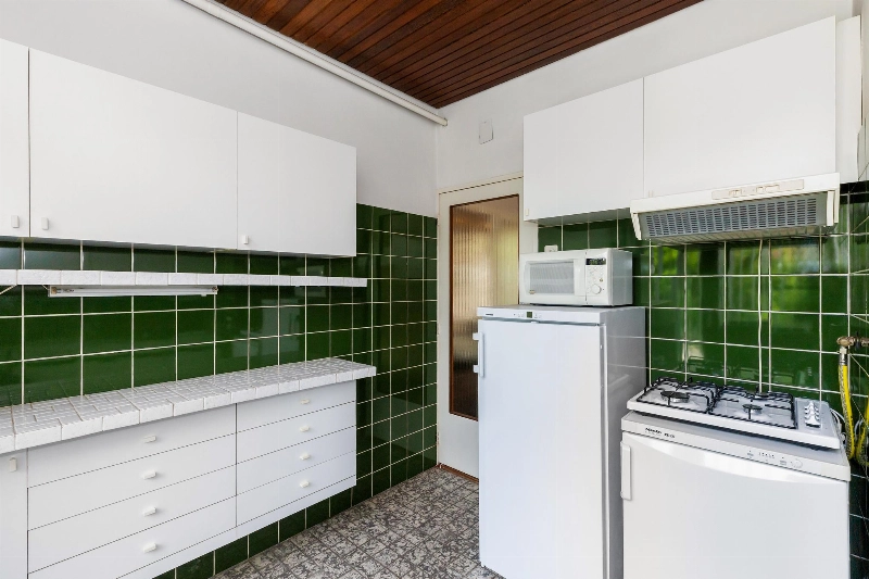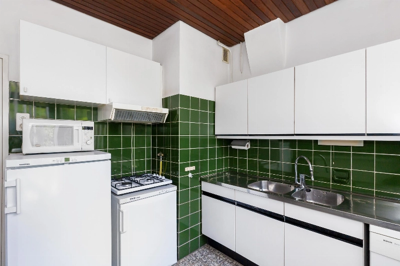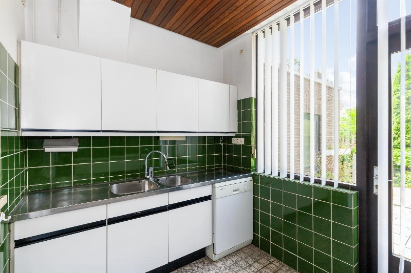 De keuken heeft een mooie afmeting en is voorzien van een eenvoudige witte opstelling met veel mogelijkheden voor modernisering.