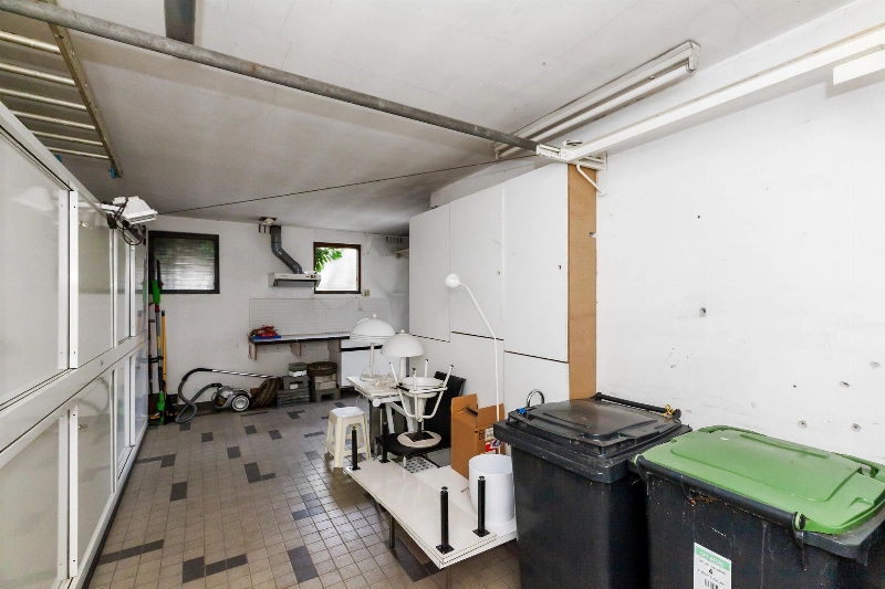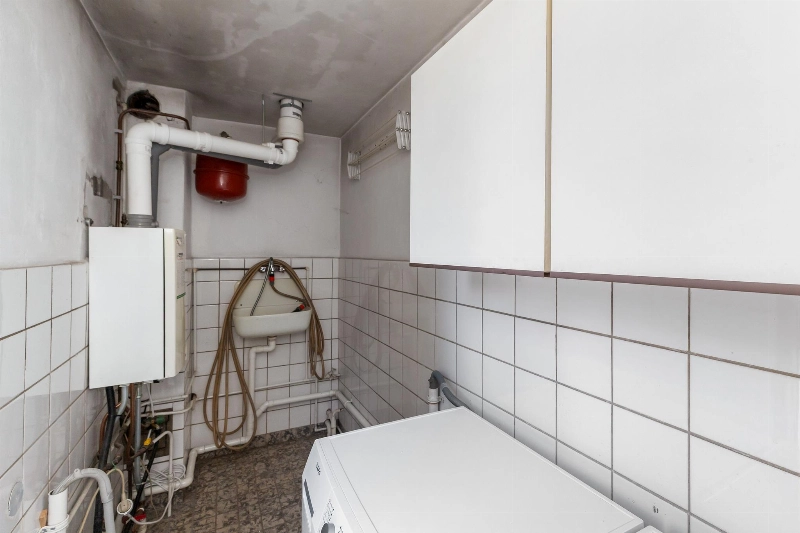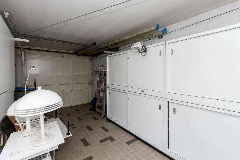 Vanuit de tuin is de garage en het stookhok te bereiken. Het stookhok heeft de opstelling van de c.v. ketel (Remeha Avanta 2008), een uitstortgootsteen met warm en koud water en de aansluiting voor de wasmachine en droger.