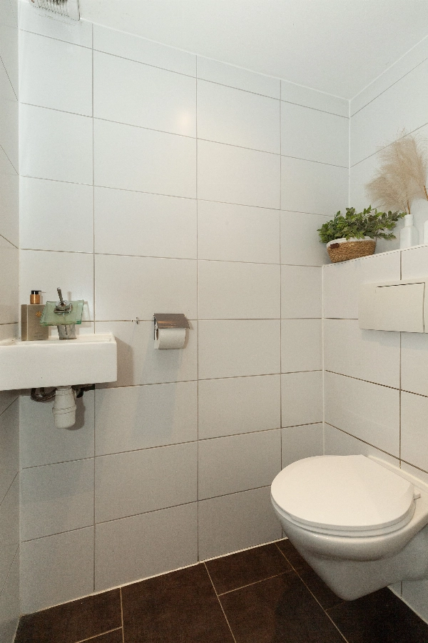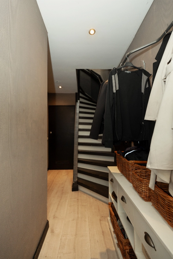 Via de voordeur stap je meteen in de gang. Deze is diep en heeft een meterkast, een trapkast en achterin vind je het geheel betegelde toilet met zwevend closet en fontein.