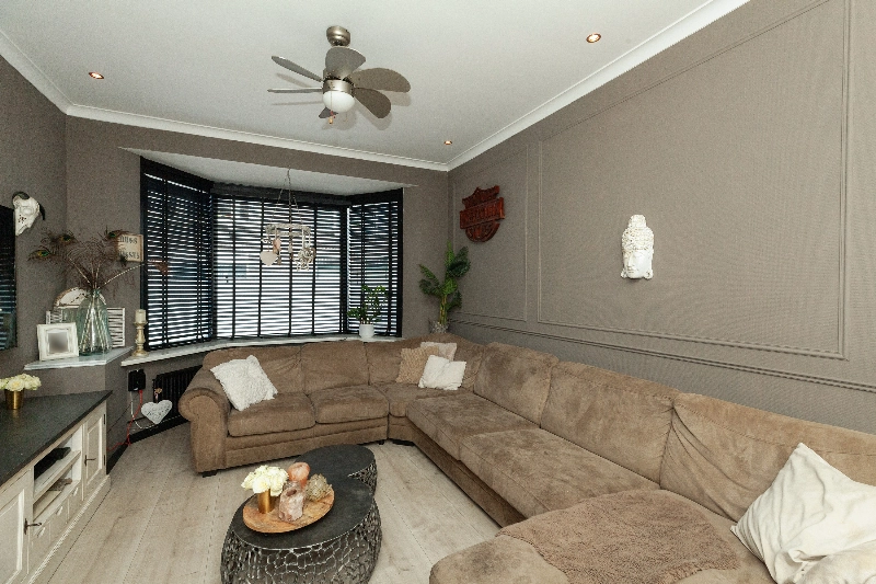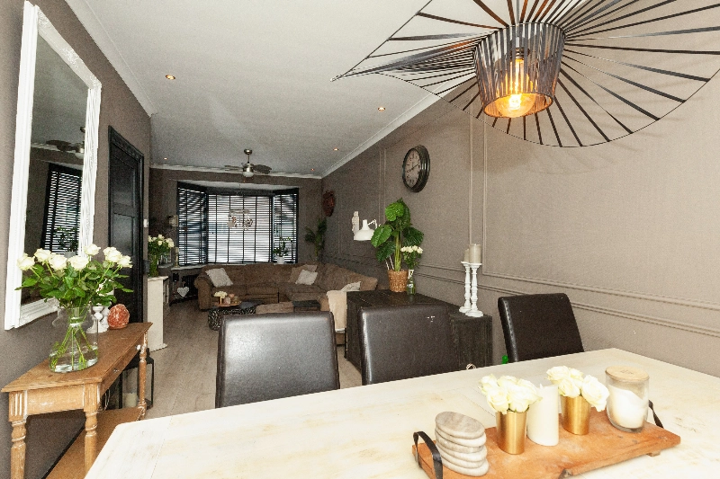 Aan de achterzijde is er meer dan genoeg ruimte voor een grote eettafel en er zijn twee openslaande deuren naar de tuin.