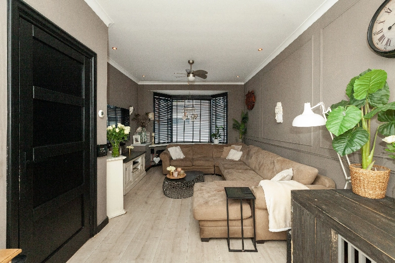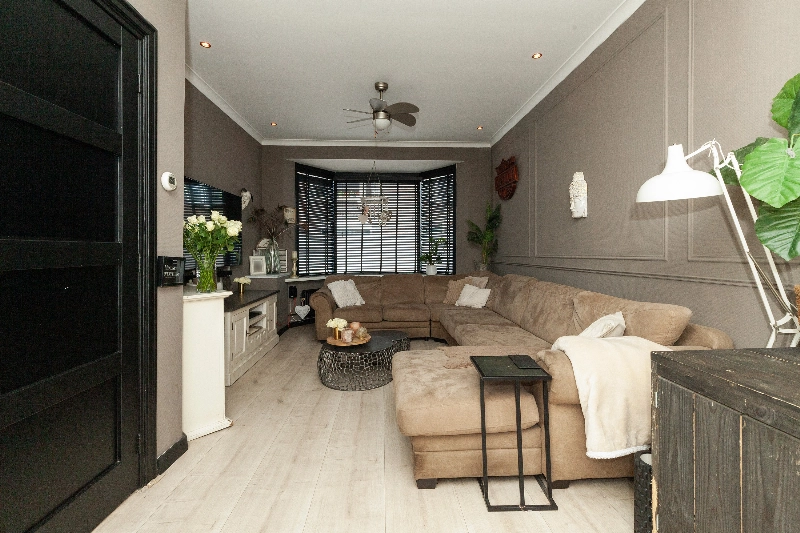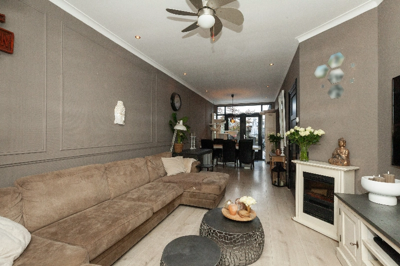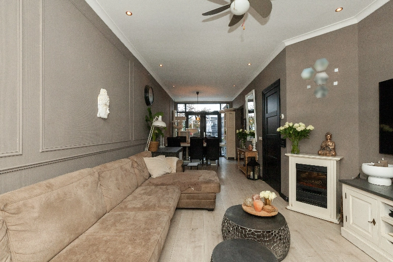 Tussendeur naar de woonkamer. Deze doorzonwoonkamer heeft een fijne zithoek aan de voorzijde. De erker aan de voorzijde accentueert de ruimte en geeft een leuk zicht op de straat.