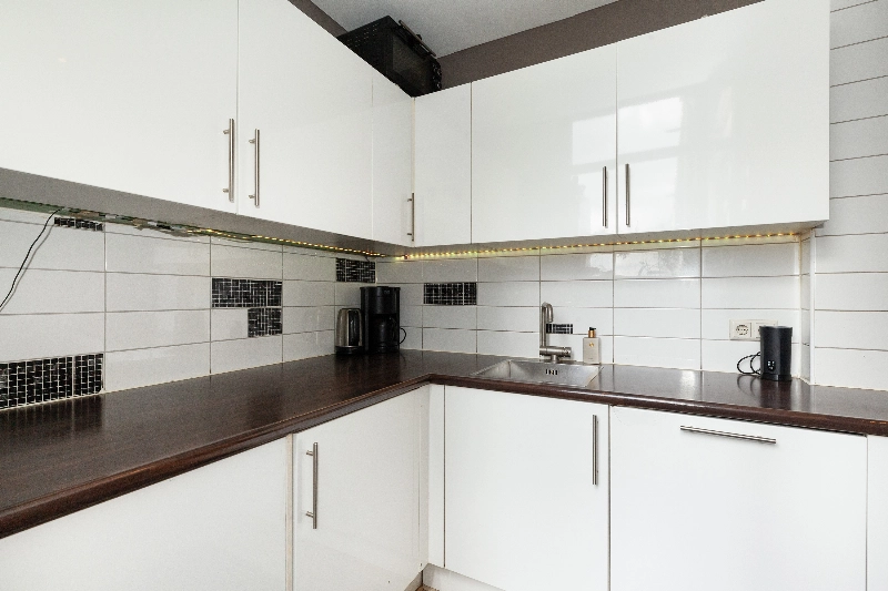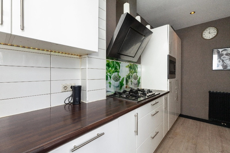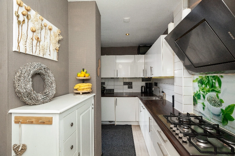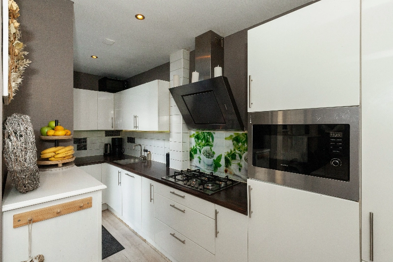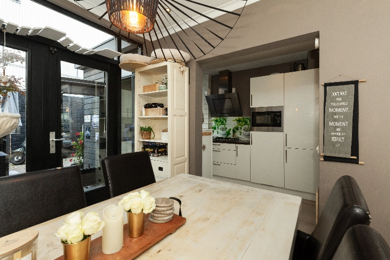 De halfopen keuken ligt ook aan de achterzijde en is afgewerkt met een witte hoogglans hoekopstelling voorzien van afzuigkap, 5 pits gaskookplaat, koelkast, vaatwasser, wasmachine en drogeraansluiting en veel kastruimte. Het werkblad is in kunststof uitgevoerd en er is achterwandbetegeling aanwezig. Via de keuken bereik je tevens de achtertuin.