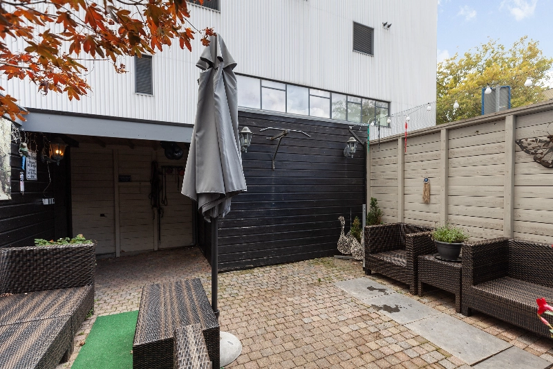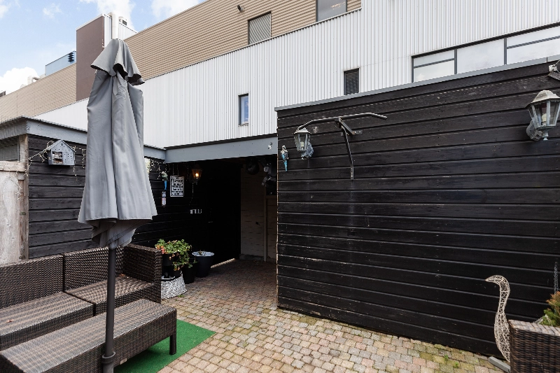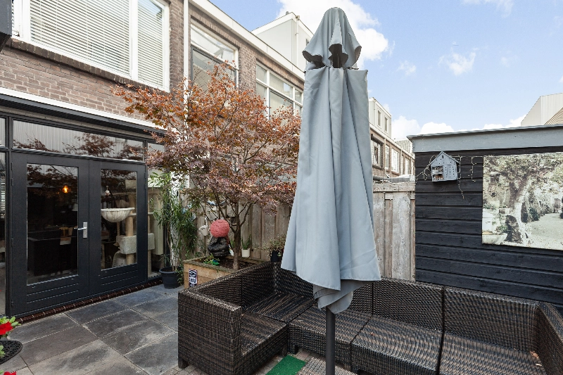 De tuin is op het oosten gelegen en is voorzien van bestrating, een zonnescherm, houten berging en een achterom.