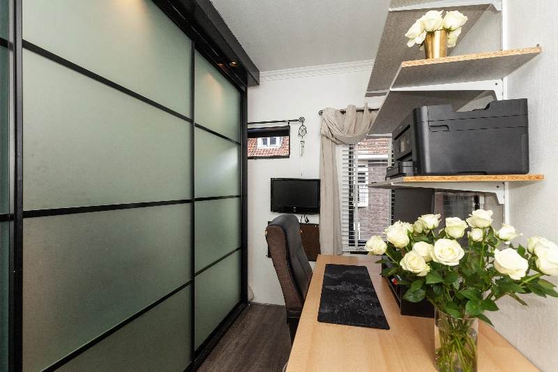 Deze gehele verdieping is voorzien van een laminaatvloer en boven het trapgat is een kast gerealiseerd voor extra bergruimte.
