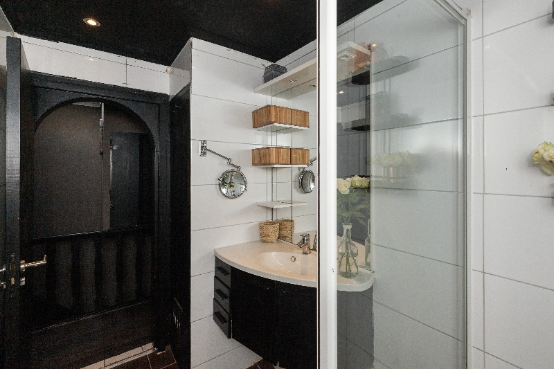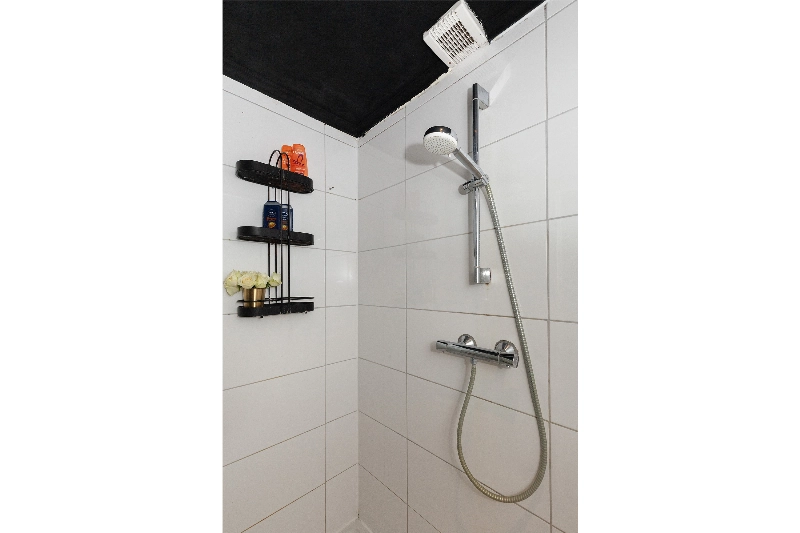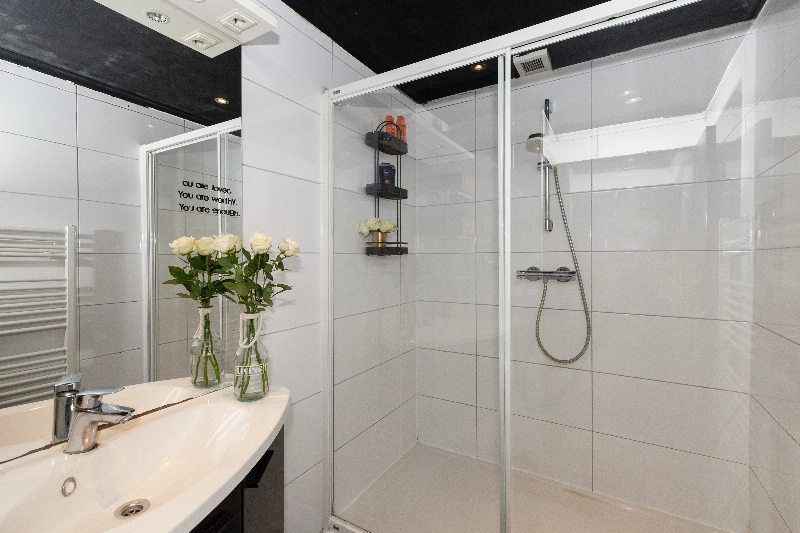 De badkamer is voorzien van witte wand- en donkere vloertegels, een grote inloopdouche, wastafelmeubel en een radiator. Tevens is hier een kast voor de CV.