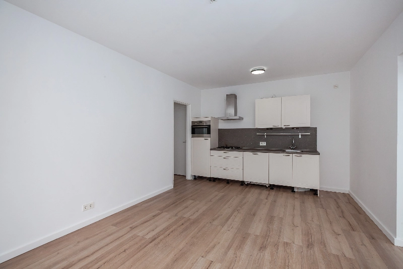 Deze kamer heeft 2 grote raampartijen en dat geeft veel licht in de kamer. Er is een vaste kast voor extra bergruimte. De open keuken heeft een eenvoudige witte opstelling voorzien van inbouwapparatuur, waaronder een koelkast, 4 pits gaskookplaat, afzuigschouw, vaatwasser, spoelbak en een combimagnetron.