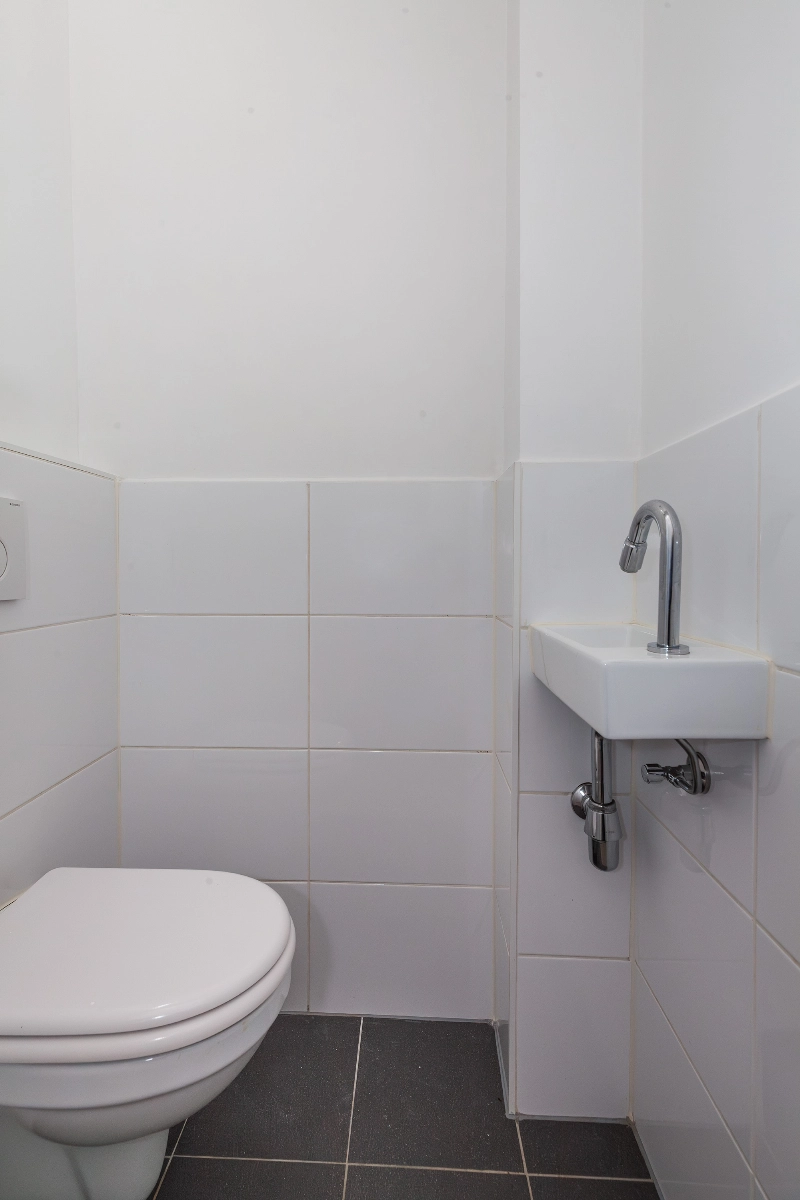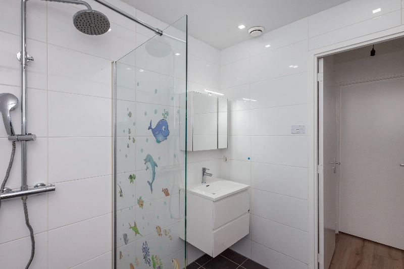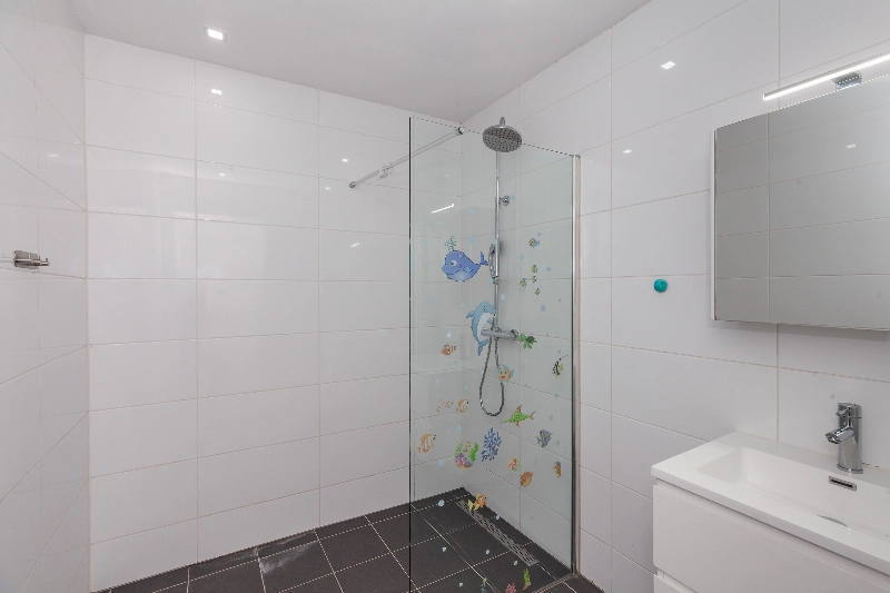 De badkamer is geheel luxe betegeld en voorzien van witte wandtegels en antraciet vloertegel. Tevens vind je hier een ruime inloopdouche en een wastafelmeubel met spiegel.