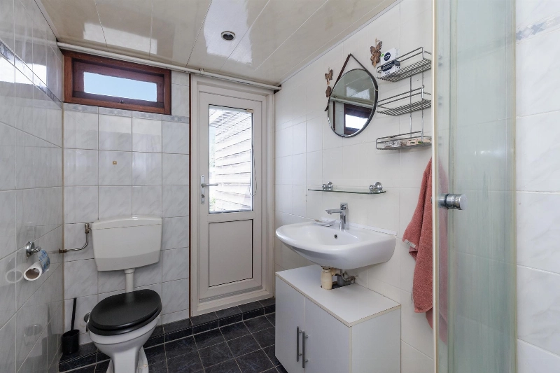 De badkamer heeft witte marmerlook wandtegels, zwarte vloertegels en beschikt over een douchehoek, een wastafel, een toilet en een kunststof kozijn met deur naar het platte dak.