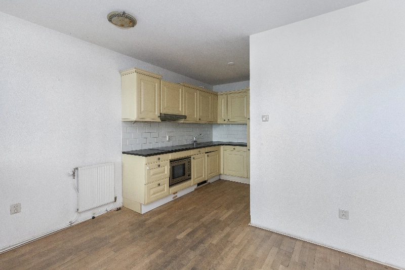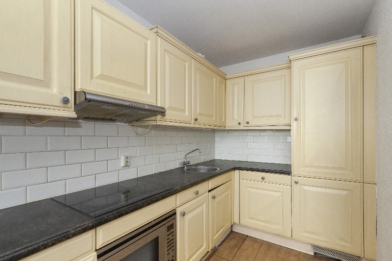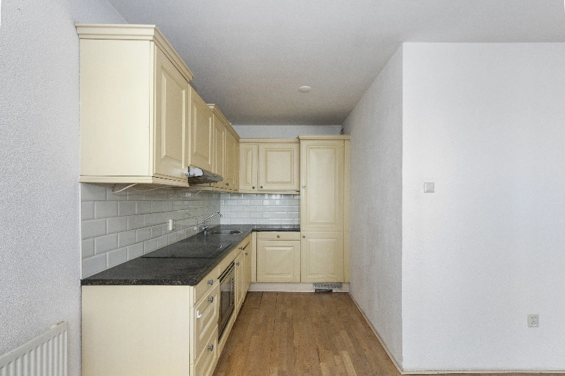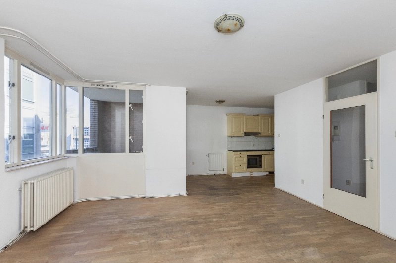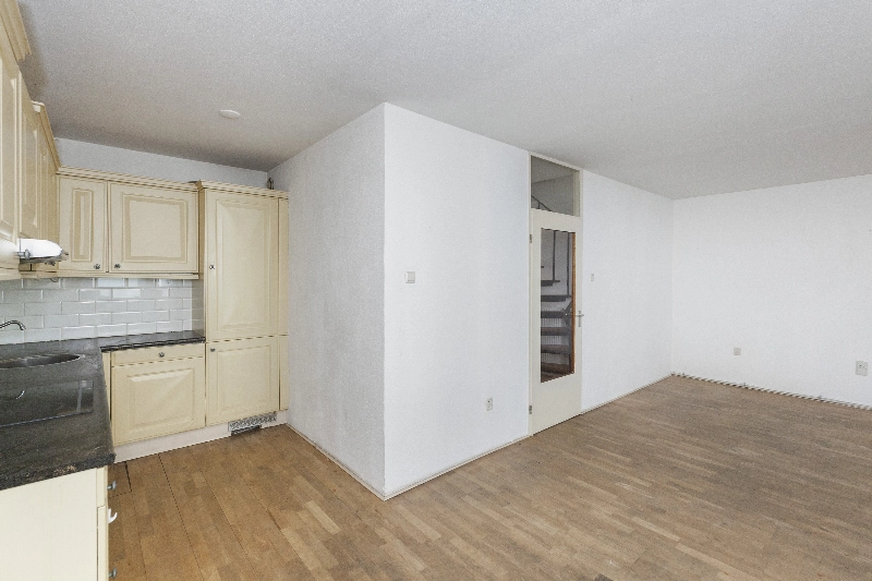 De woonkamer heeft een houten parketvloer welke is doorgelegd in het gehele appartement. De open keuken heeft een gele L-vormige inrichting en is voorzien van een gaskookplaat, een afzuigkap, een oven, een vaatwasser, een koelkast en een vriezer.
