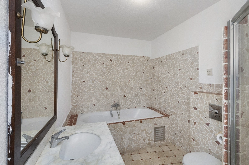 De moderne badkamer heeft lichte betegeling en is voorzien van een douchehoek, een ligbad, een toilet en een wastafelmeubel.