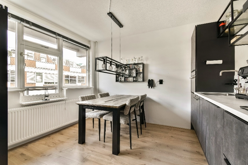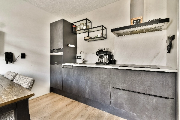 Aan de voorzijde van het appartement bevindt zich de moderne keuken (2019) uitgevoerd in het antraciet grijs met een marmerlook aanrechtblad. De keuken is compleet uitgerust met een inductiekookplaat, een RVS afzuigkap, een combi-oven en een vaatwasser.