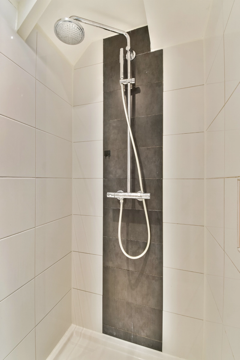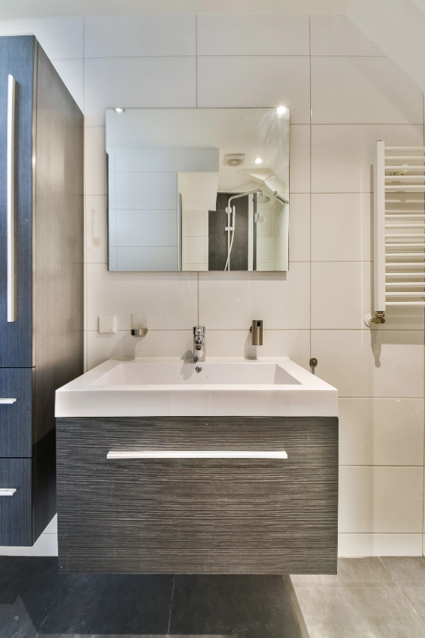 De ruime badkamer is modern uitgevoerd met witte en antraciet betegeling, een ruime douchehoek met een glazen wand en een regendouche, een wastafelmeubel met een spiegel, een badkamerkast en een handdoekradiator.
