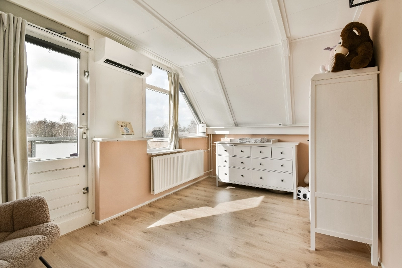 De gezellige woonkamer is afgewerkt met een mooie houtlook laminaatvloer die doorloopt over de gehele verdieping. Daarnaast is de ruimte voorzien van een airco die kan koelen, verwarmen en ontvochtigen. Via de woonkamer heb je toegang tot het op het westen gelegen balkon, waar tevens de buitenunit van de airco is geplaatst.