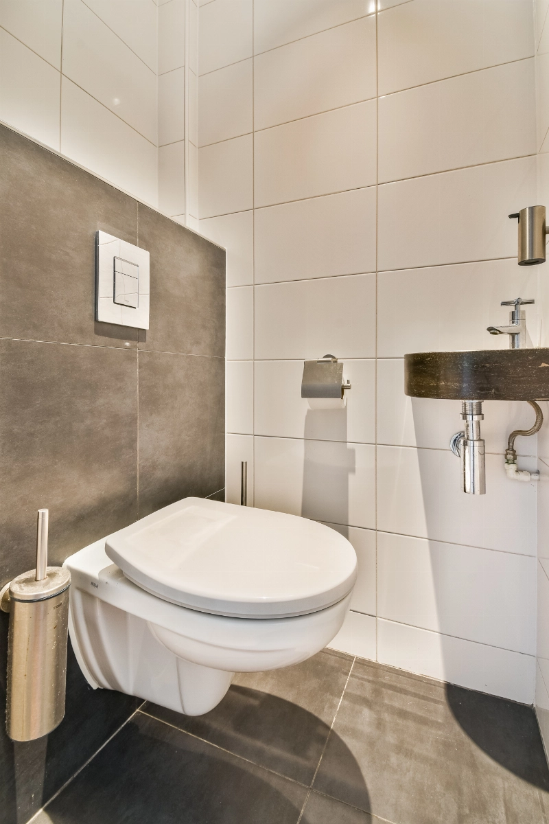 De tussenhal beschikt over een praktische trapkast en een modern toilet met antraciet en witte betegeling, een zwevend toilet en een fonteintje. Hier bevindt zich tevens de trap naar de bovenverdieping.