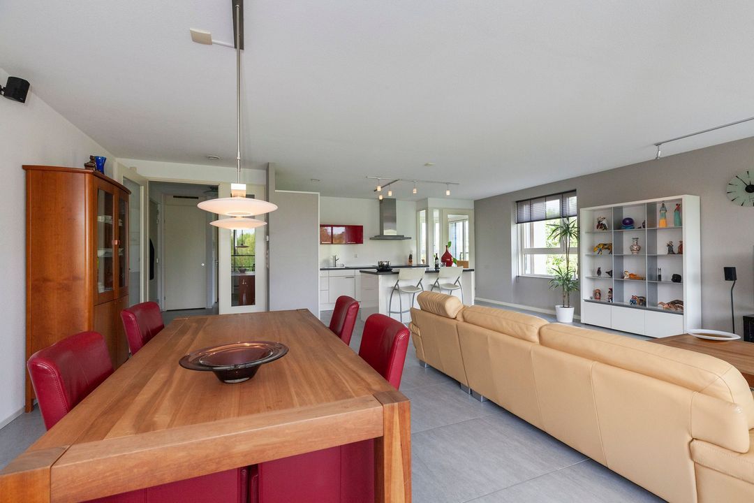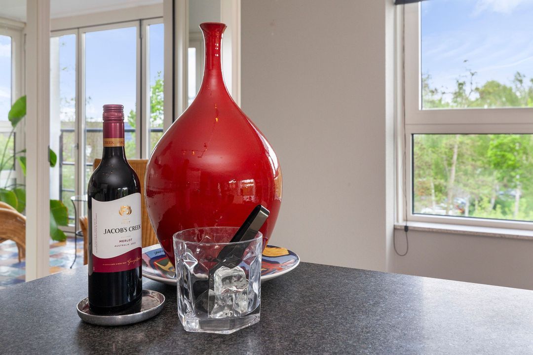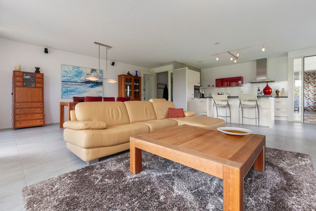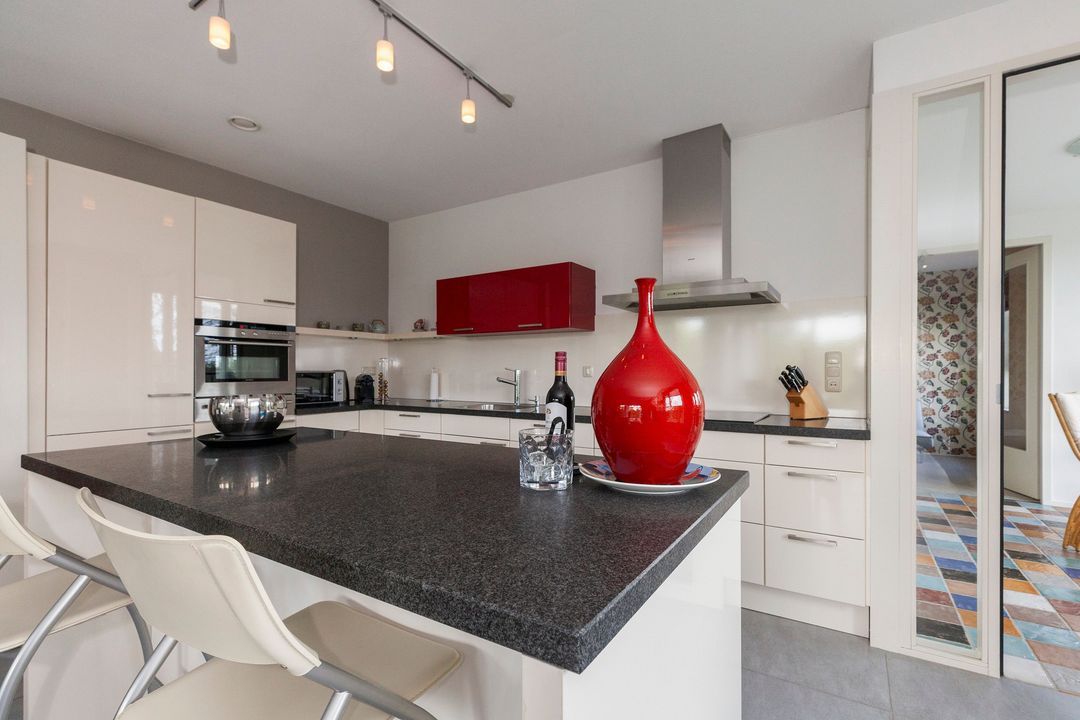 Een tussendeur met glas brengt u in de heerlijke ruime woonkamer met de mooie lichte hoogglans hoekkeuken met een zwart hardstenen aanrechtblad en een werkeiland met eetbar. De keuken is voorzien van een inductiekookplaat, een RVS afzuigkap, een combi-oven, een koelkast, een vriezer en een vaatwasser.