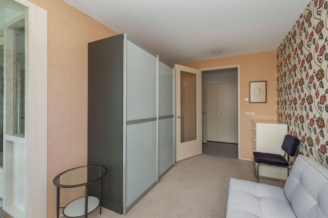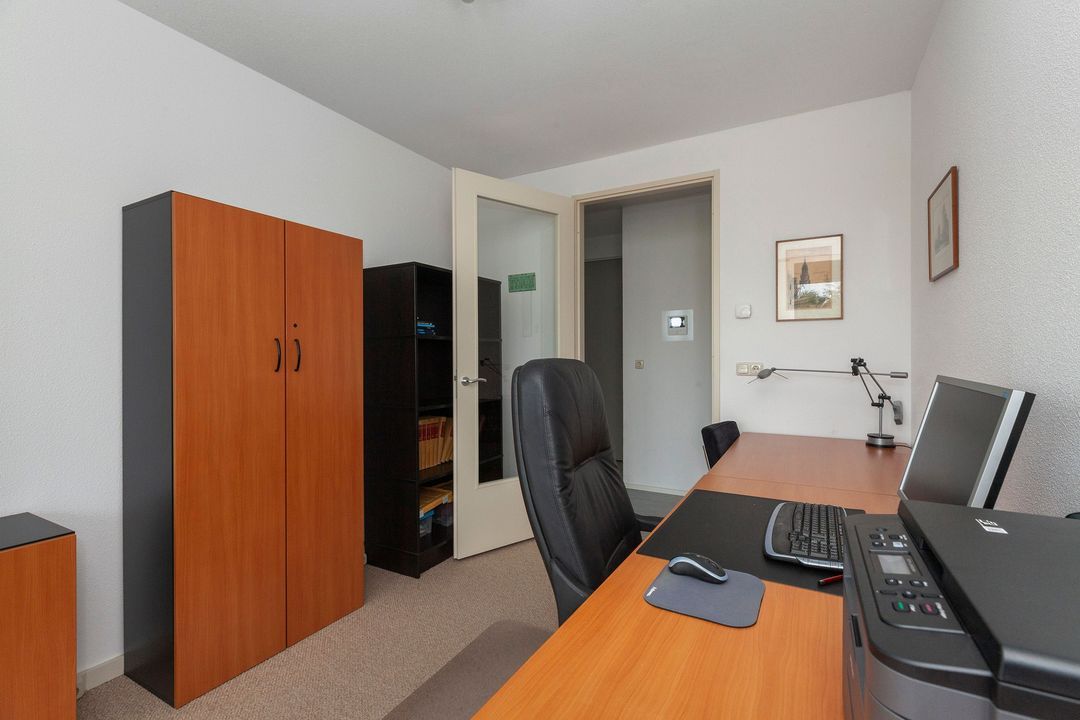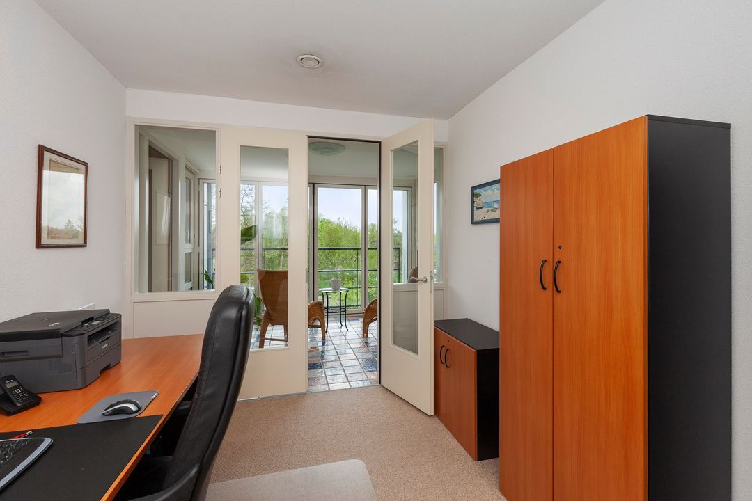 De slaapkamer/werkkamer sluit direct aan op de serrekamer, maar is ook via de hal te bereiken. Deze kamer heeft een afmeting van ca. 3.85 x 2.80m en heeft twee openslaande deuren.