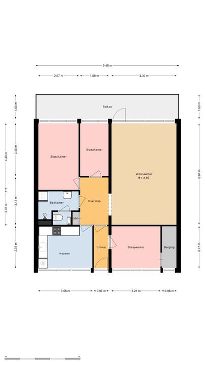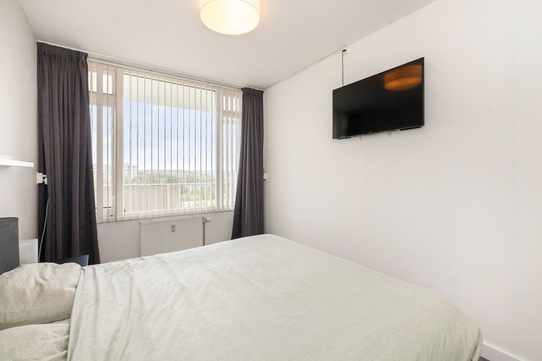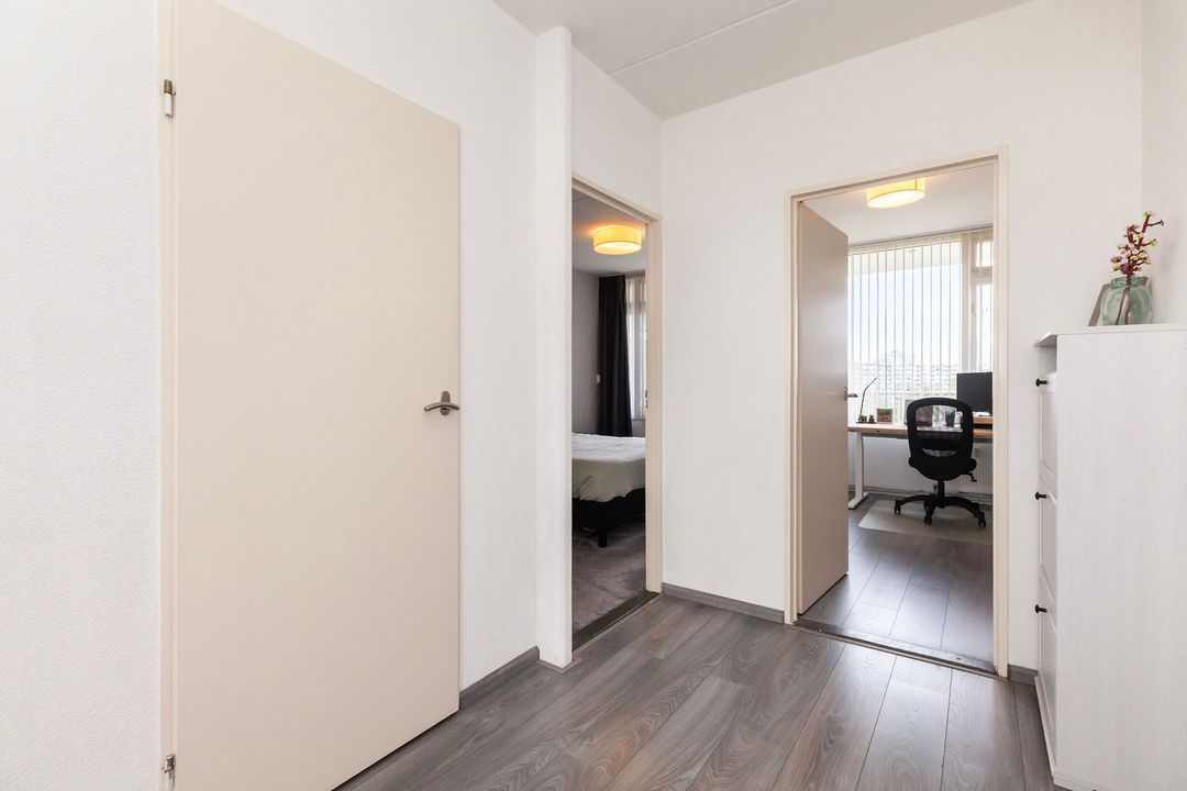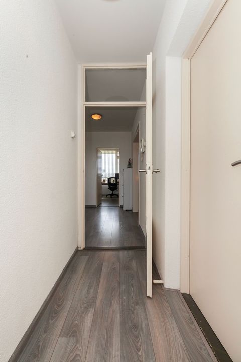 Entree op de 9e verdieping. U komt binnen in een tochtportaal met directe toegang tot de eerste ruime slaapkamer aan de galerijzijde. Deze kamer is voorzien van een handige berging en meet ca. 3.24 x 2.77m.