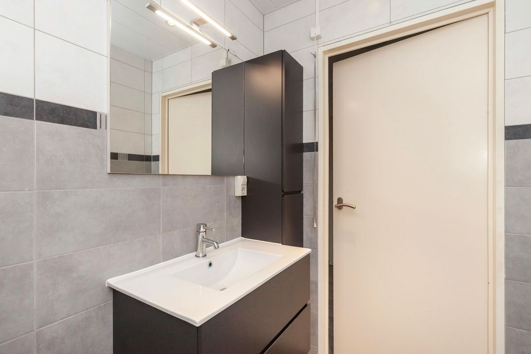 De moderne badkamer is stijlvol en modern ingericht met licht/donkergrijze tegels, een douchehoek met glazen deuren, een fraai wastafelmeubel met lades en een spiegel met verlichting. Het toilet is apart, maar vanuit de badkamer bereikbaar, en uitgevoerd in dezelfde moderne stijl.