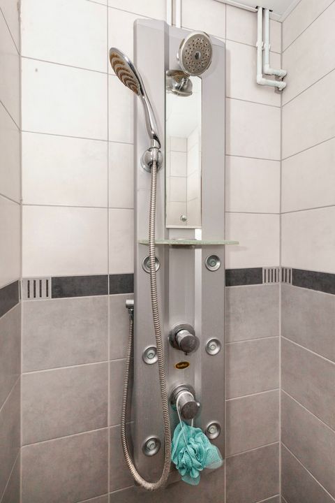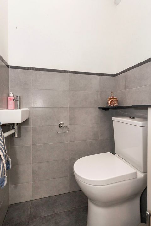 De moderne keuken, uitgevoerd in strak hoogglans grijs, is van alle gemakken voorzien van inbouwapparatuur. Ook de badkamer ademt eigentijdse luxe dankzij de combinatie van licht- en donkergrijze tegels.