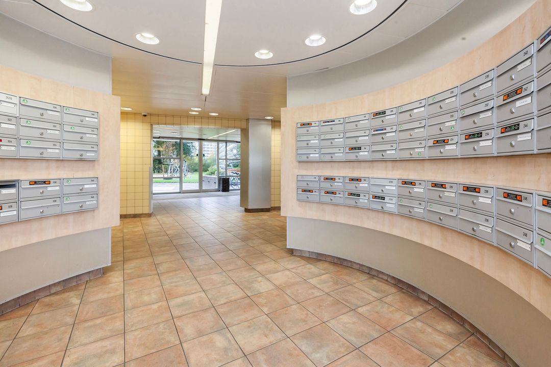 Centrale entree met brievenbussen, toegang tot de bergingen en afgesloten hal met liften en trappenhuis.