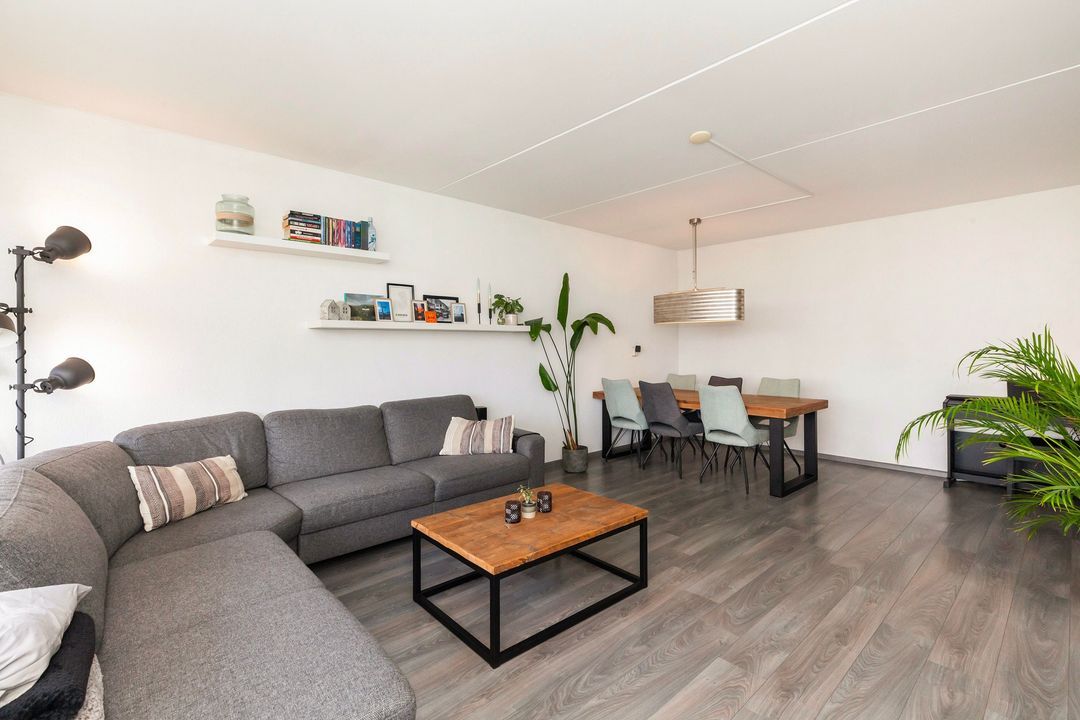 De woonkamer is een gezellige leefruimte met een groen uitzicht en directe toegang tot het balkon over de volle breedte van het appartement. Hier geniet u in alle rust van het buitenleven en de opkomende zon.
