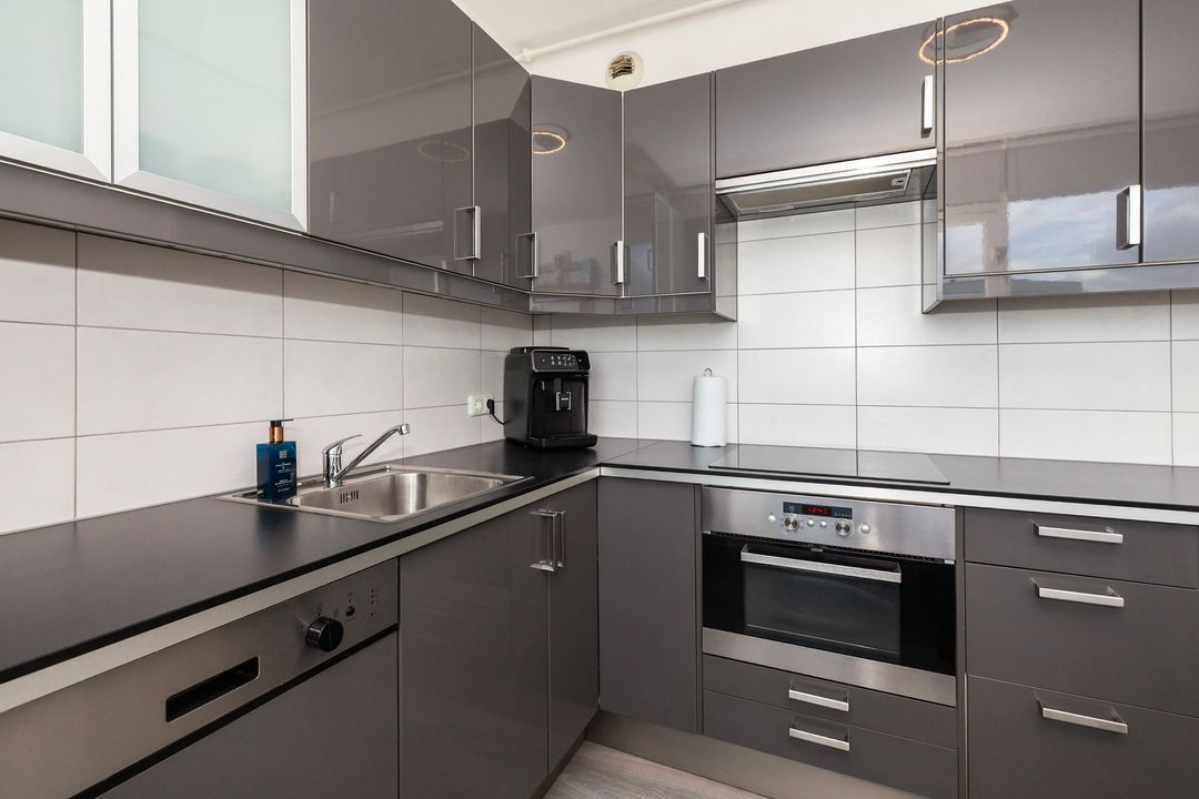 De moderne hoogglans grijze keuken heeft een L-vormige keukenopstelling en is volledig uitgerust met een inductiekookplaat, een vlakschermafzuigkap, een vaatwasser, een koel-/vriescombinatie en een combi-oven - alles wat u nodig heeft om met plezier te koken.