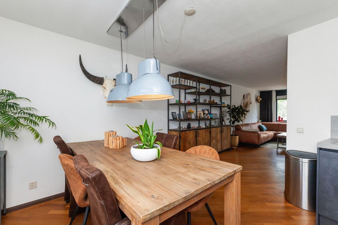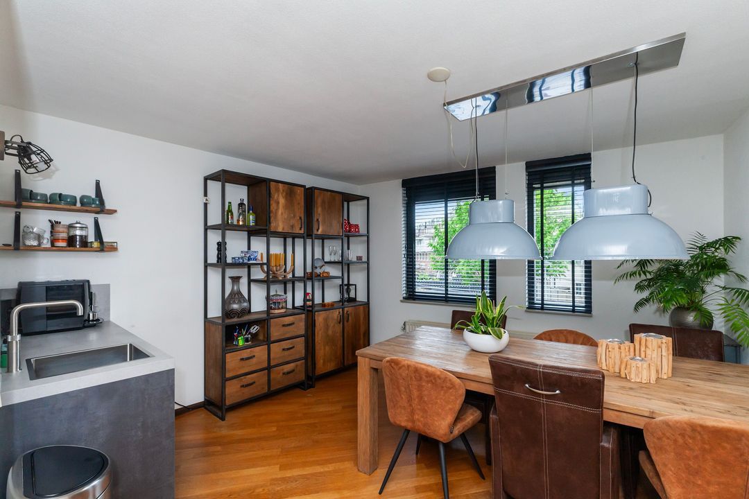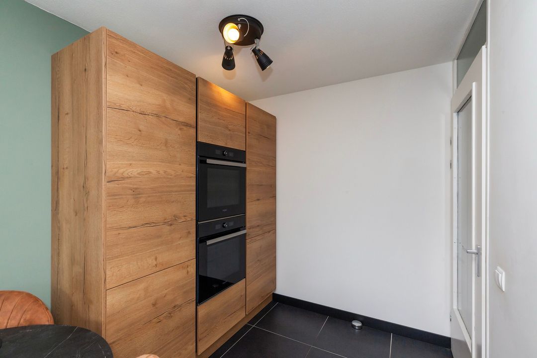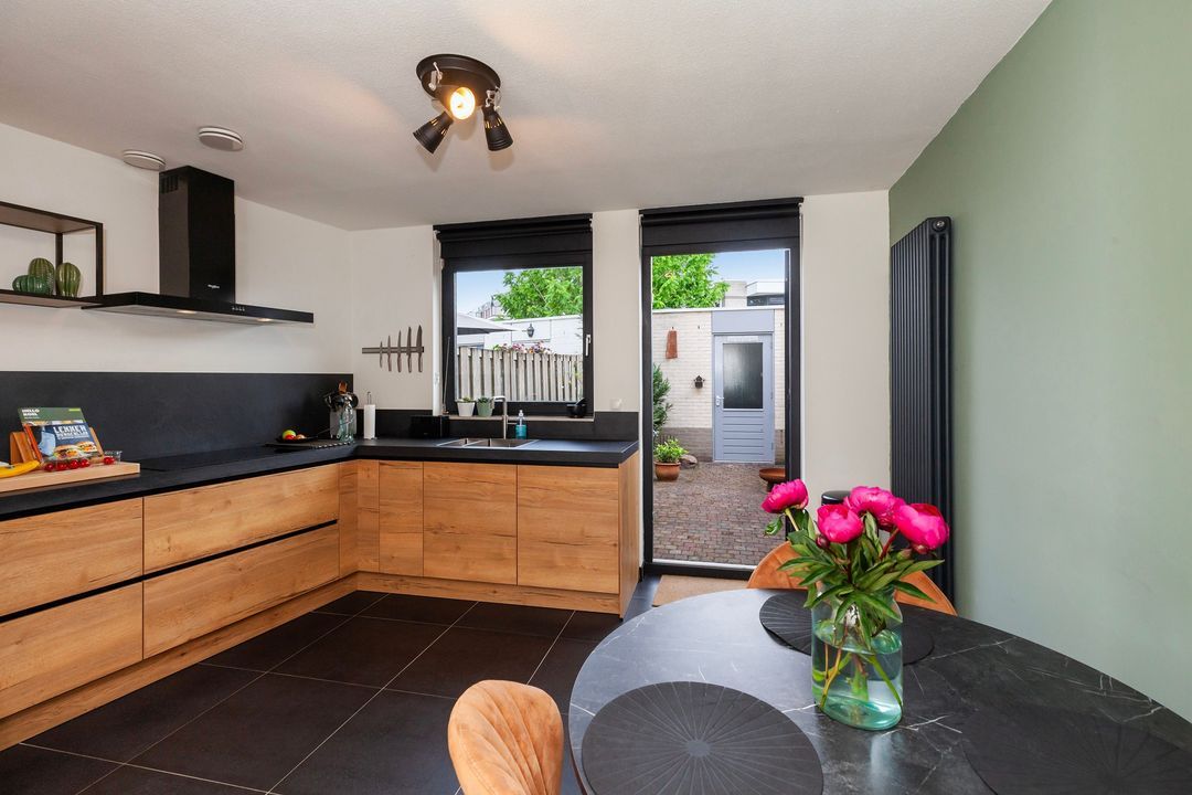 Aan de achterzijde van de woning bevindt zich de sfeervolle woonkeuken. Deze moderne keuken uit 2021 is uitgevoerd in een houtlook met een zwart MDF blad en voorzien van een inductiekookplaat, een zwarte afzuigkap, een vaatwasser en een Quooker . In het hoge kastengedeelte bevinden zich een koelkast, een vriezer en twee ovens. Verder heeft de keuken een mooie zwarte plavuizen vloer, veel opbergruimte en is er een mooie design radiator.