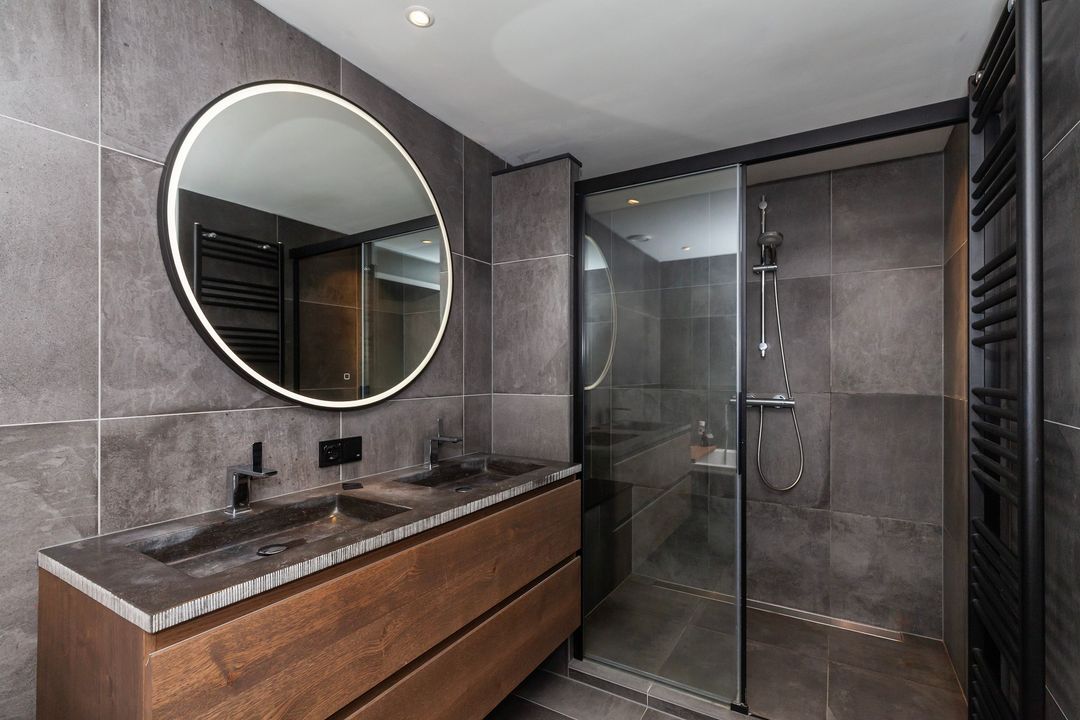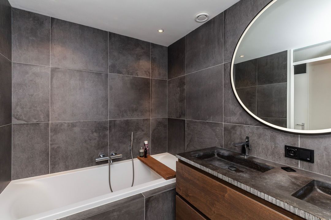 De prachtige badkamer is in 2021 vernieuwd en is voorzien van mooie antraciet betegeling, een ligbad, een ruime inloopdouche met glazen schuifdeur, een dubbel wastafelmeubel met een hardstenen blad, een spiegel met verlichting en verwarming, een handdoekradiator en spotverlichting in het plafond.