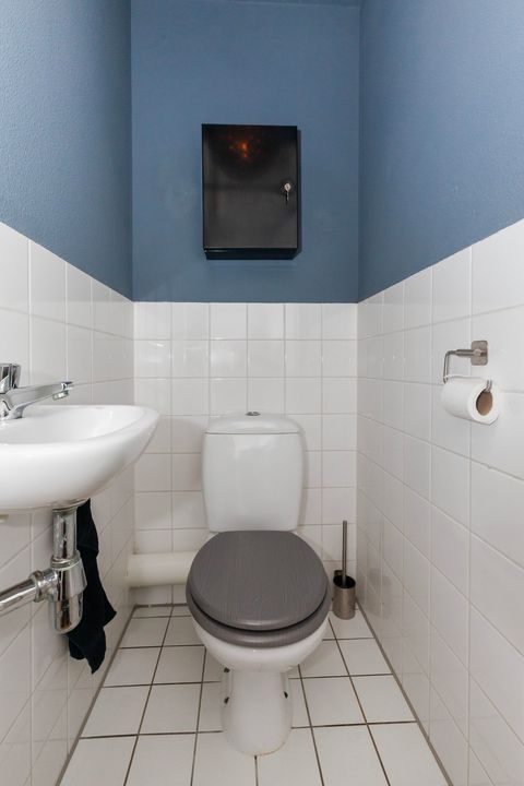 Er is een aparte toiletruimte met witte betegeling, een duoblok en een fonteintje.