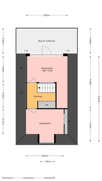 Slaapkamer III ( 3.95 x 2.48/4.96m) is ruim en heeft toegang tot het mogelijke dakterras.