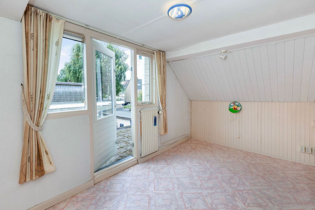 Slaapkamer II (2.37/3.07 x 3.60m) aan de voorzijde van de woning heeft speelse indeling door het schilddak en de dakkapel.