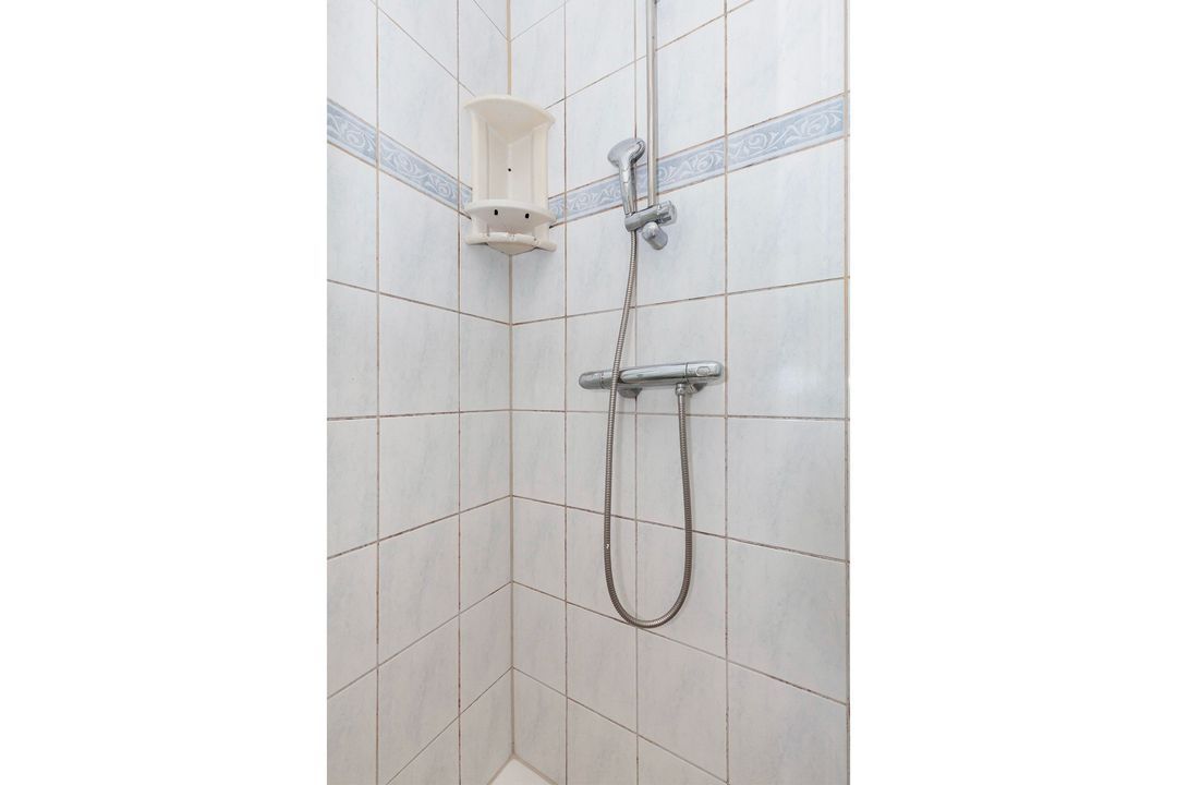 De badkamer is volledig betegeld in een kleurcombinatie van lichte wanden en blauwe vloertegel. In de badkamer bevinden zicht het toilet, wasmachine aansluiting, handdoekradiator en douchecabine met mengkraan en handdouche.