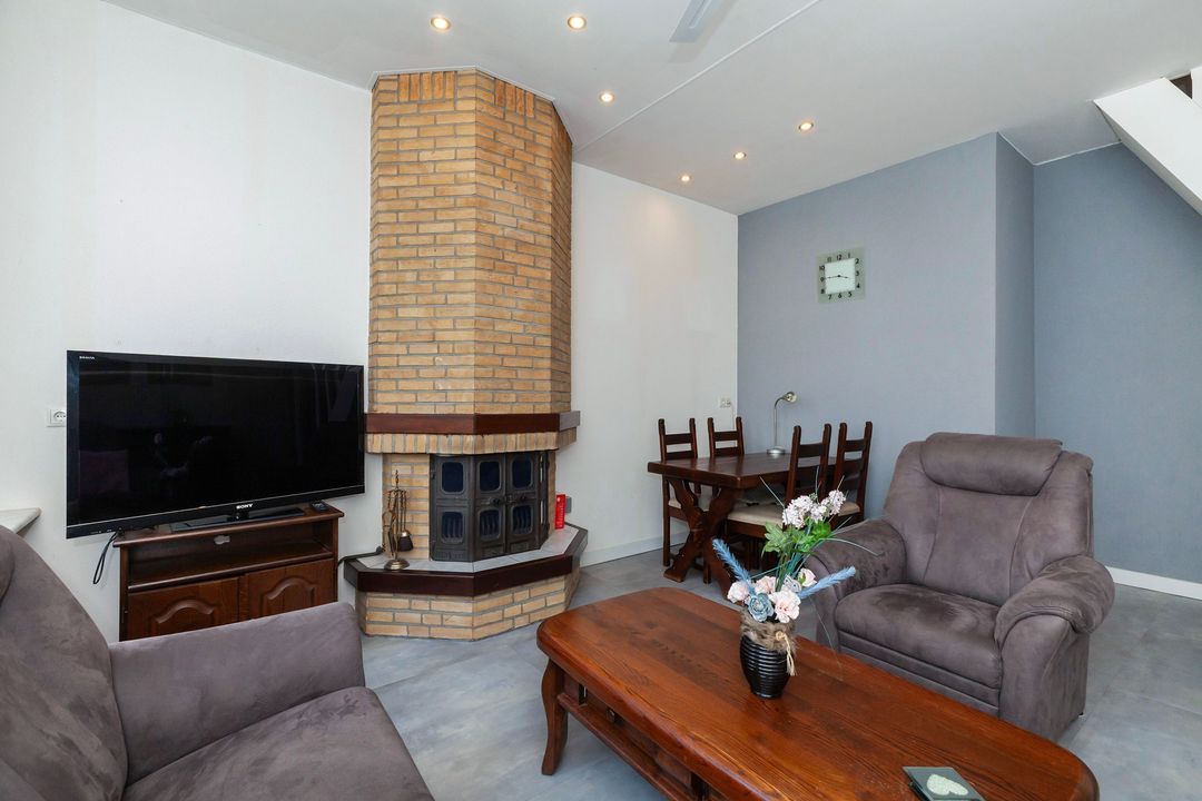 De gezellige woonkamer met een houthaard, PVC-vloerafwerking met vloerverwarming, spachtelputz wanden en geïsoleerde woning scheidende wanden, is gelegen aan de voorzijde van de woning. Vanuit de woonkamer is een opentrap naar de eerste etage.