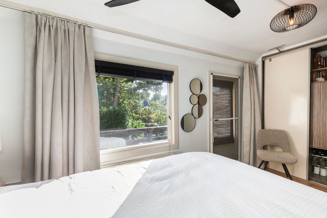 Slaapkamer I, gelegen aan de achterzijde van de woning, met toegang tot het balkon. Op het balkon is een praktische houten kast.