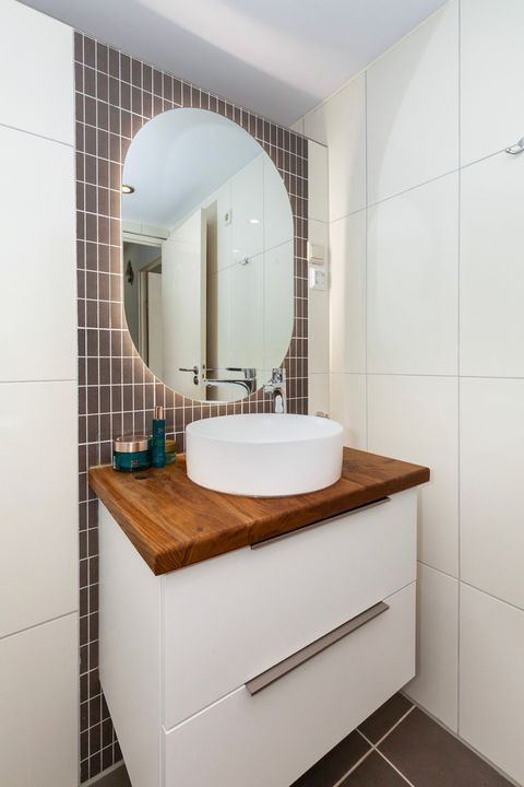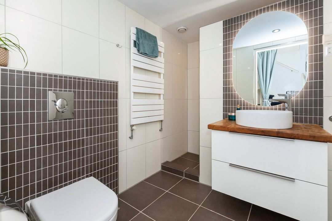 De moderne badkamer is fris en strak afgewerkt met crème wandtegels en taupe vloertegels. Hier vindt u een ruime inloopdouche, een modern wastafelmeubel met een waskom en eiken blad, een verlichte en verwarmde spiegel, een handdoekradiator en een zwevend toilet.