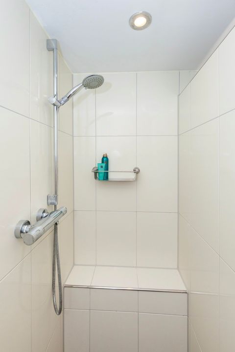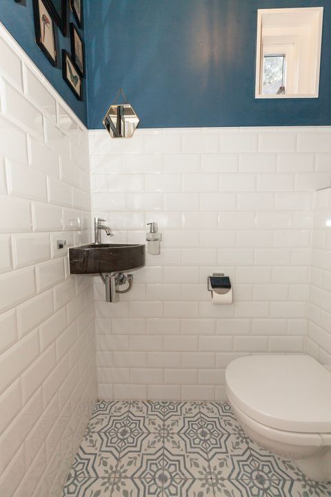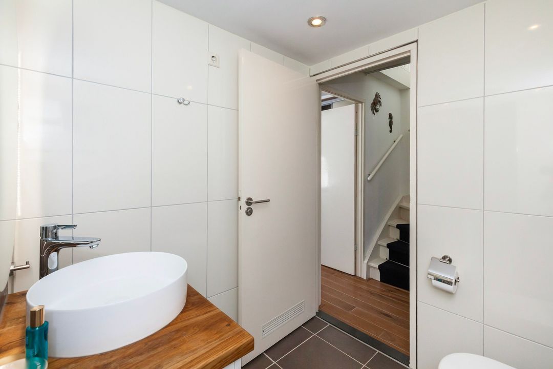 De modern toiletruimte is eveneens helemaal van nu met witte metro wandbetegeling, Portugese vloertegels met elektrische vloerverwarming, een zwevend toilet en een fonteintje.