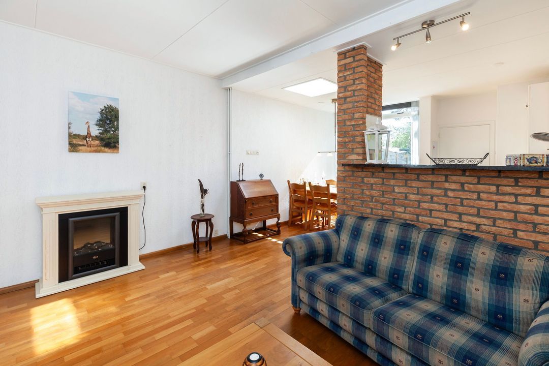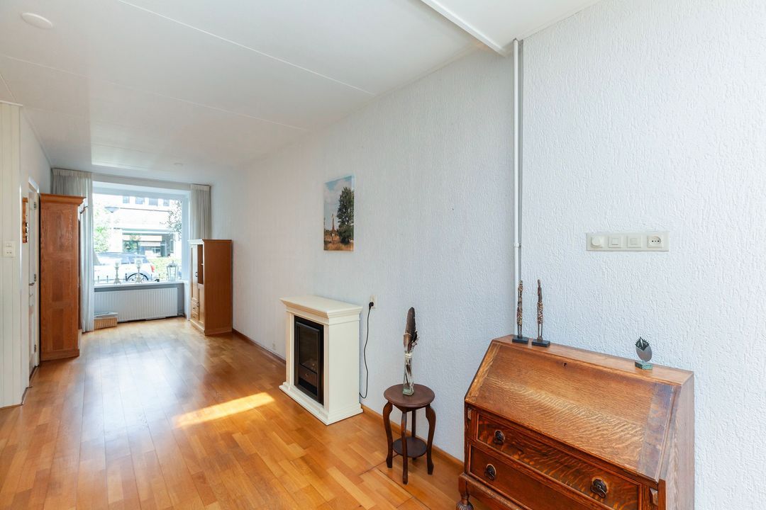 De ruime woonkamer heeft aan de voorzijde een sfeervolle erker met een kunststof kozijn. Op de vloer ligt een houten parketvloer en de wanden zijn afgewerkt met granol/spachtelputz. Aan de tuinzijde is de woonkamer uitgebouwd, waarbij een grote dakkoepel zorgt voor een veel lichtinval in de open keuken. De keurige keuken is uitgevoerd in het wit met een natuurstenen aanrechtblad en beschikt over een inductiekookplaat met vlakschermafzuigkap, een koelkast, een vriezer, een oven, een vaatwasser en een Quooker kraan.