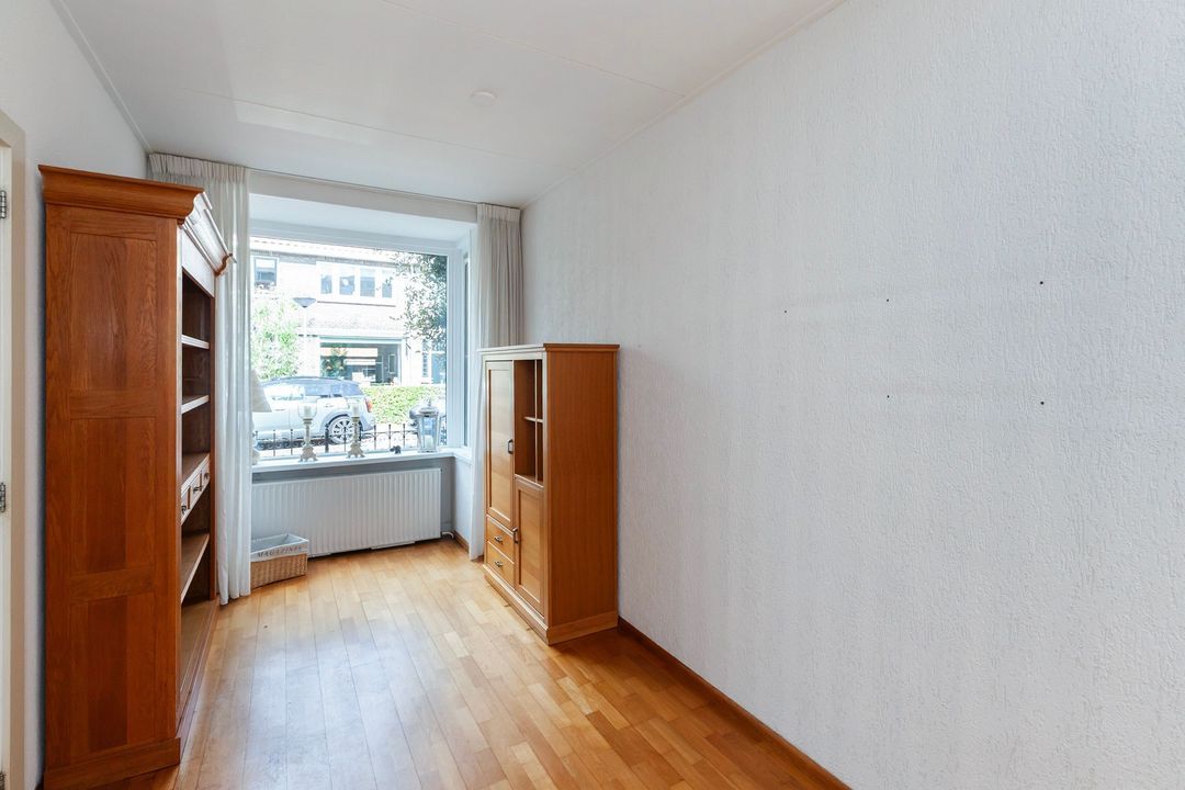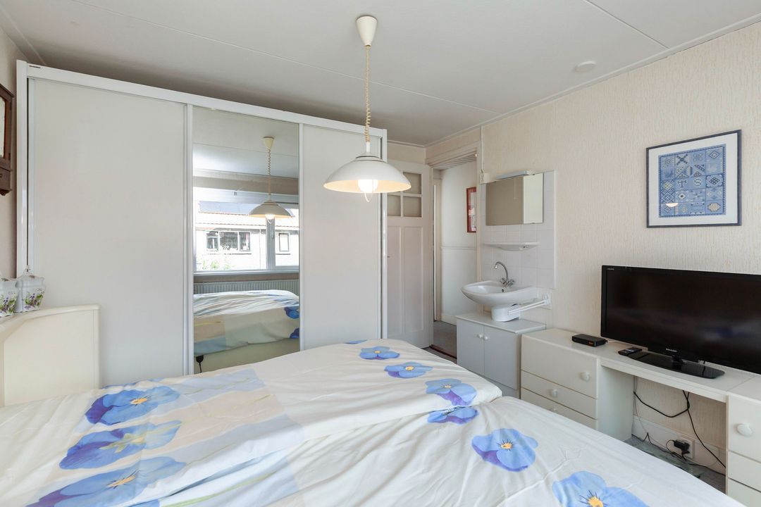 Aan de voorzijde bevindt zich een ruime slaapkamer met een kunststof kozijn en HR++ beglazing. Deze kamer beschikt over een kast met een fraai glas-in-loodraam en een wastafelmeubel.