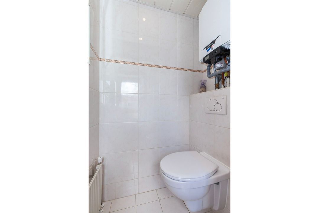 Grenzend aan de keuken vindt u een tussenhal met toegang tot het toilet, voorzien van licht tegelwerk, een zwevend toilet, een radiator en de opstelplaats van de c.v. combiketel (Remeha 2021).