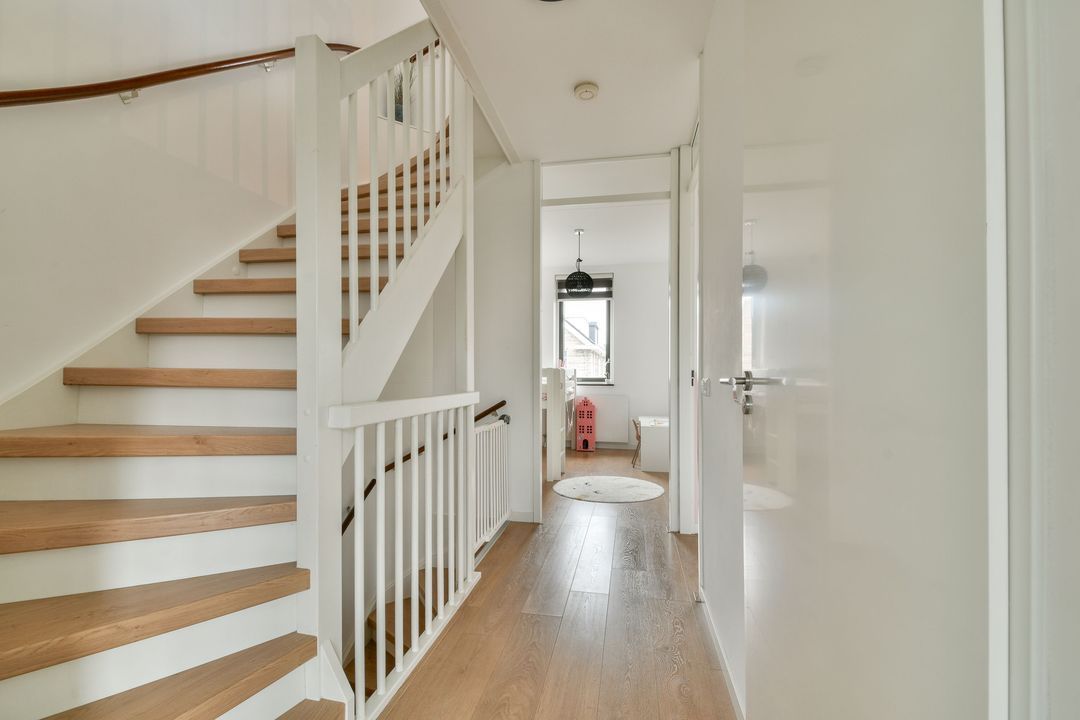 Via de brede stoep en kleine voortuin betreed je de woning. Je komt binnen in de ruime hal met een mooie eikenhouten laminaatvloer welke doorloopt naar de woonkamer en de keuken.